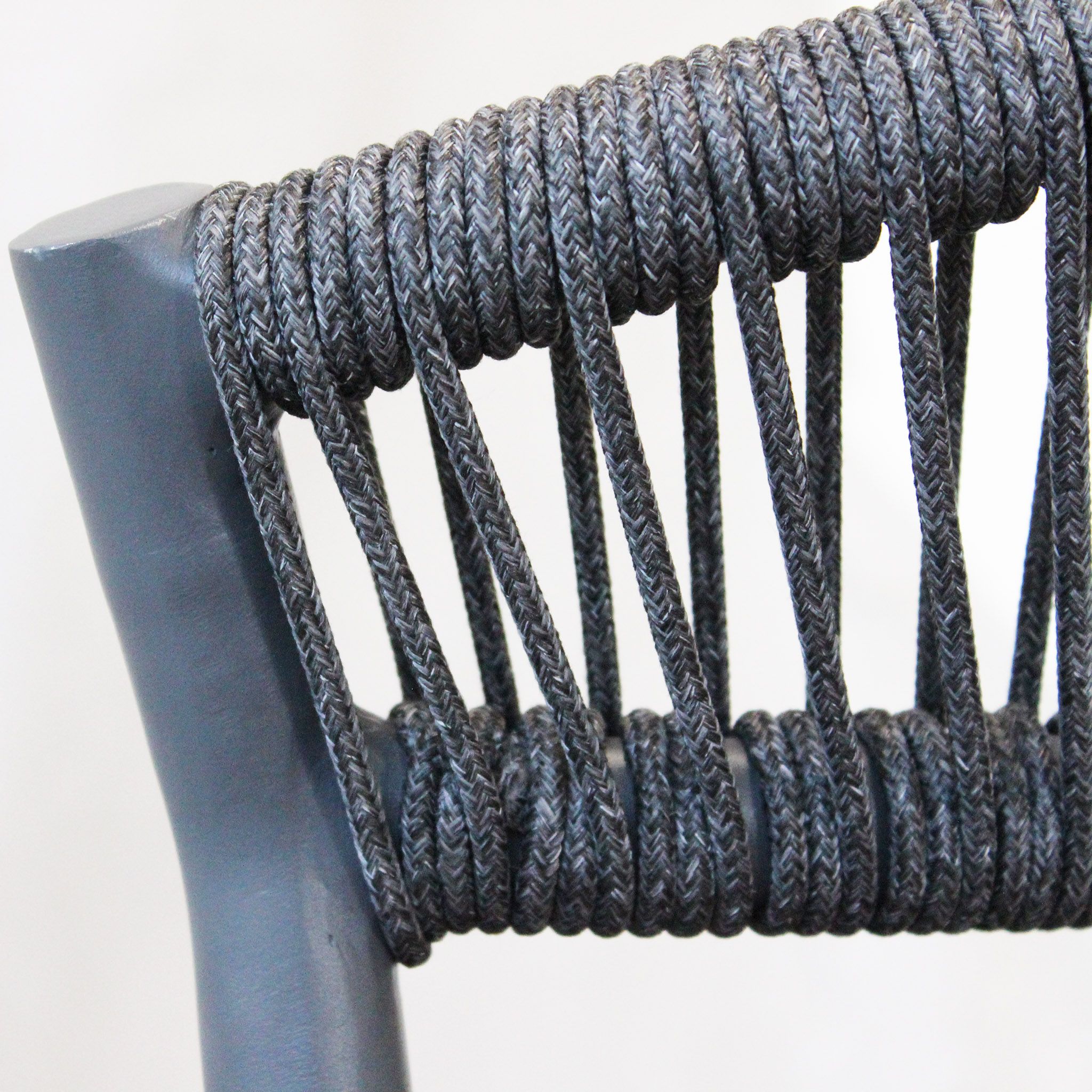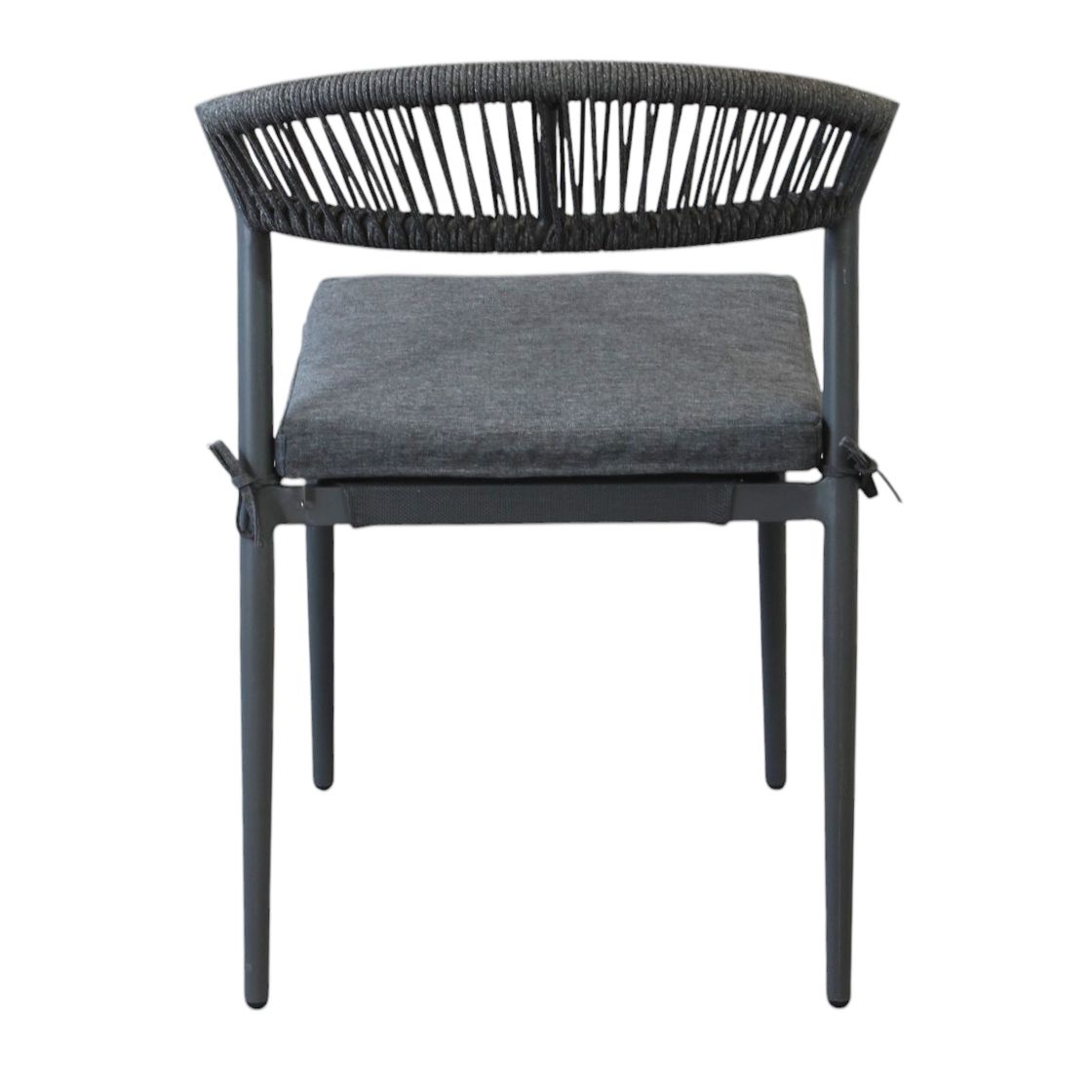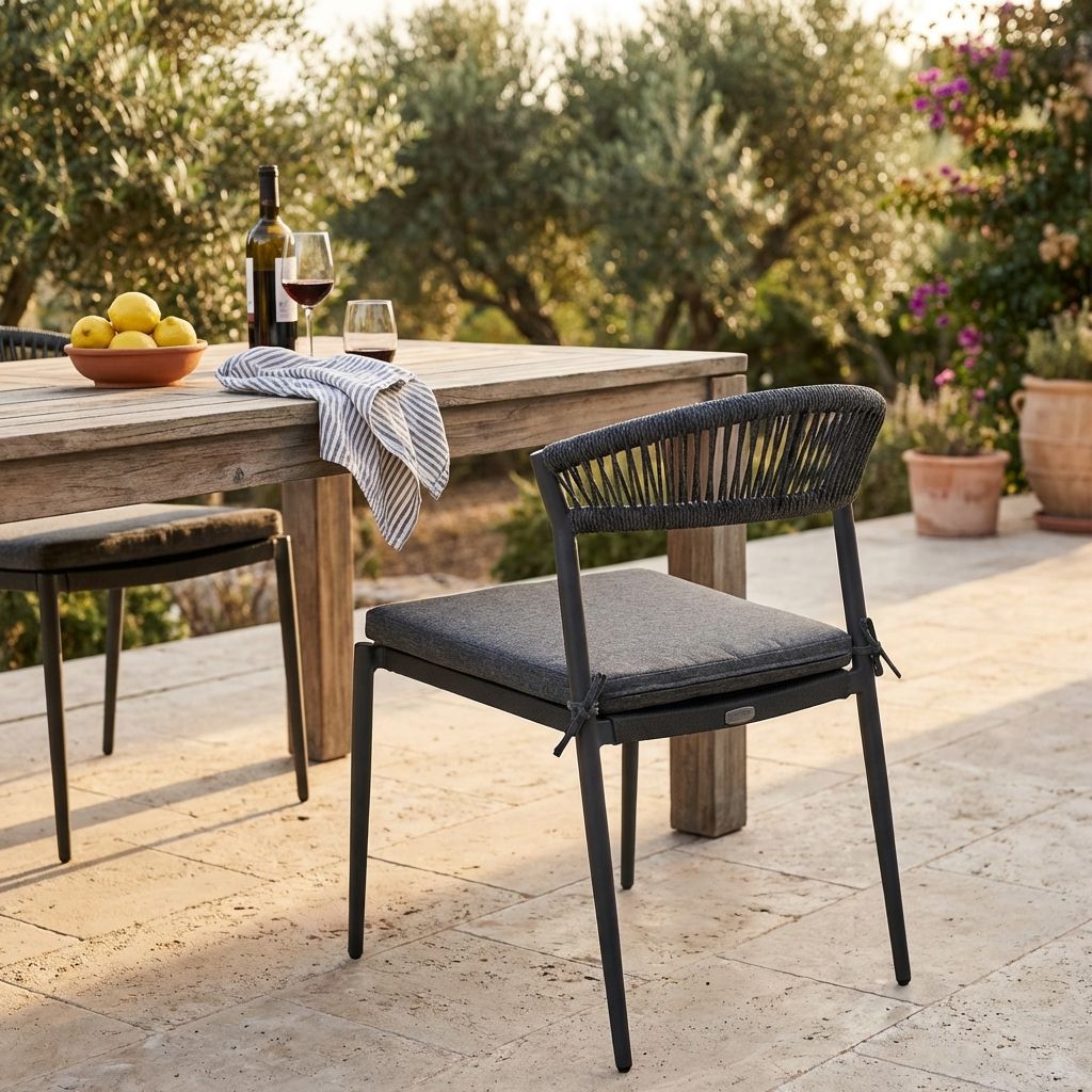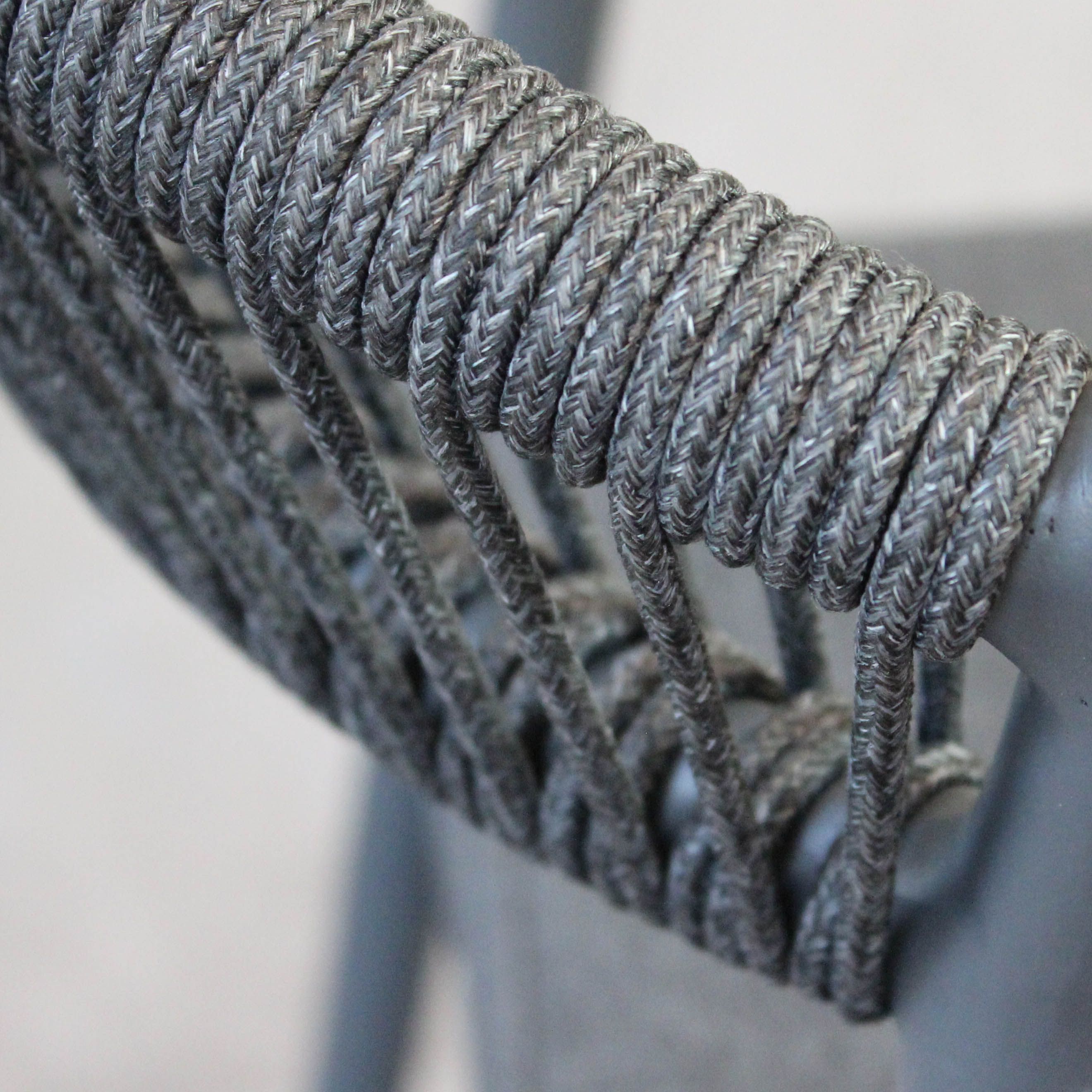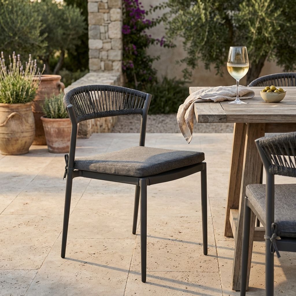Sedia da esterno con struttura in alluminio, schienale in corda e seduta in textilene. Comoda e resistente, con cuscini sfoderabili per una facile manutenzione. Disponibile nei colori bianco e antracite, si adatta a qualsiasi ambiente esterno, offrendo comfort e stile.