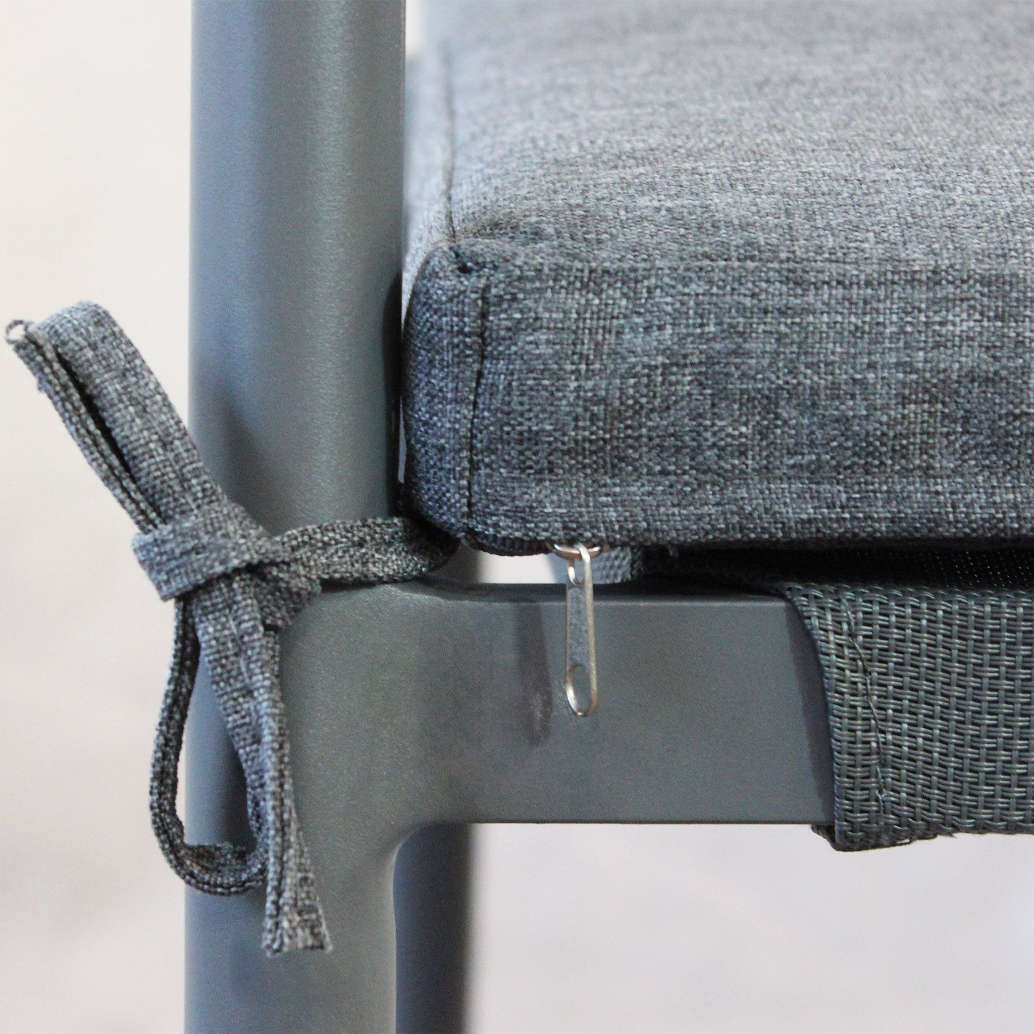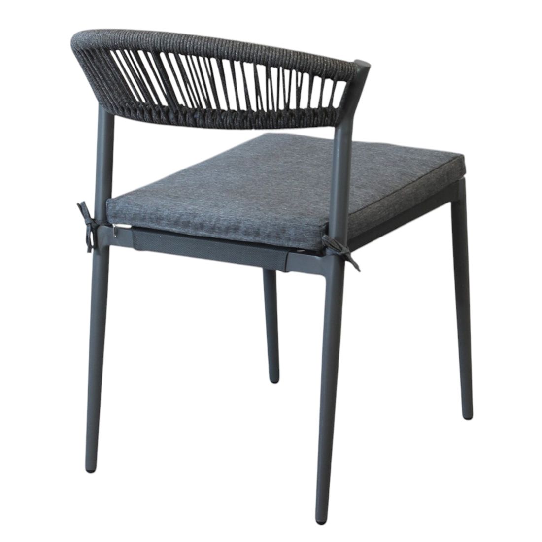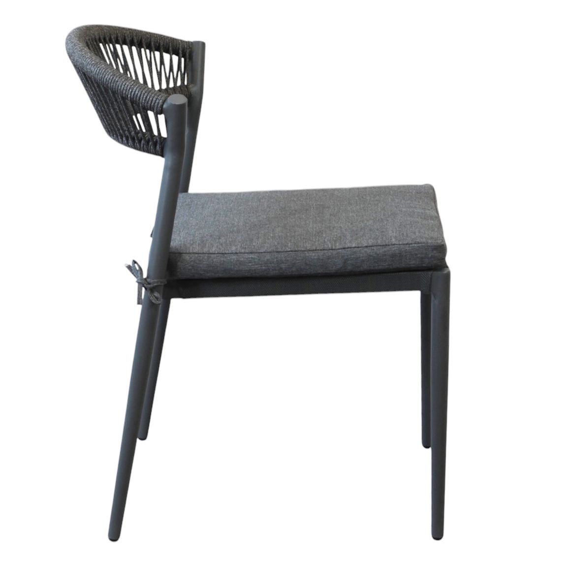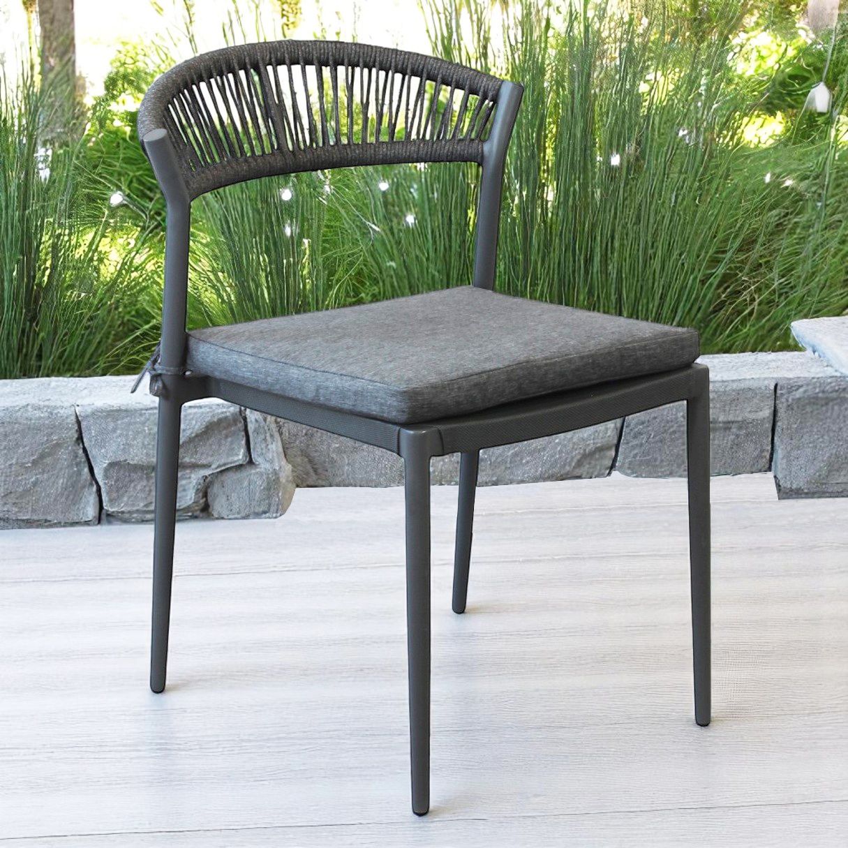 Sedia da esterno con struttura in alluminio, schienale in corda e seduta in textilene. Comoda e resistente, con cuscini sfoderabili per una facile manutenzione. Disponibile nei colori bianco e antracite, si adatta a qualsiasi ambiente esterno, offrendo comfort e stile.