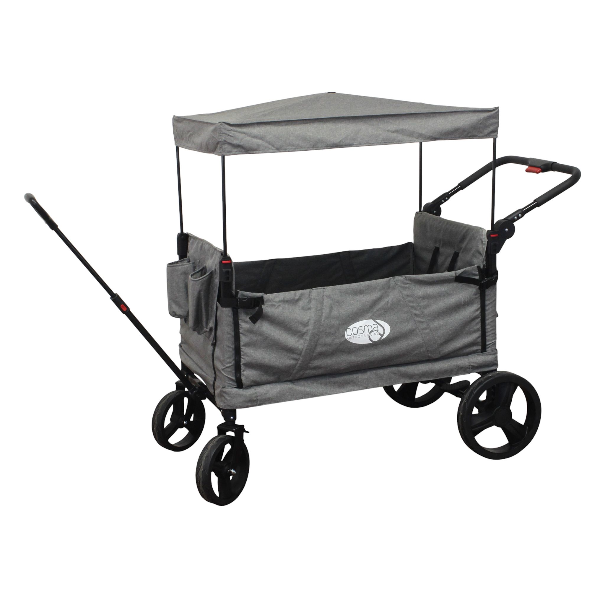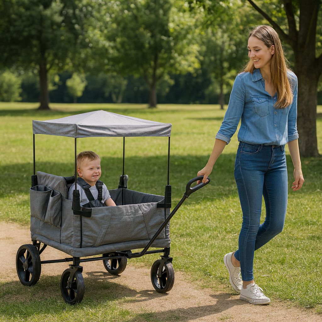 Carrello multifunzione con struttura in metallo, ruote larghe e removibili, maniglia di traino e maniglione di spinta. Include tettuccio parasole, due cinture di sicurezza, tasche laterali e portaborraccia. Ideale per spiaggia, parco o città, con zip laterali apribili e tessuto in poliestere removibile.