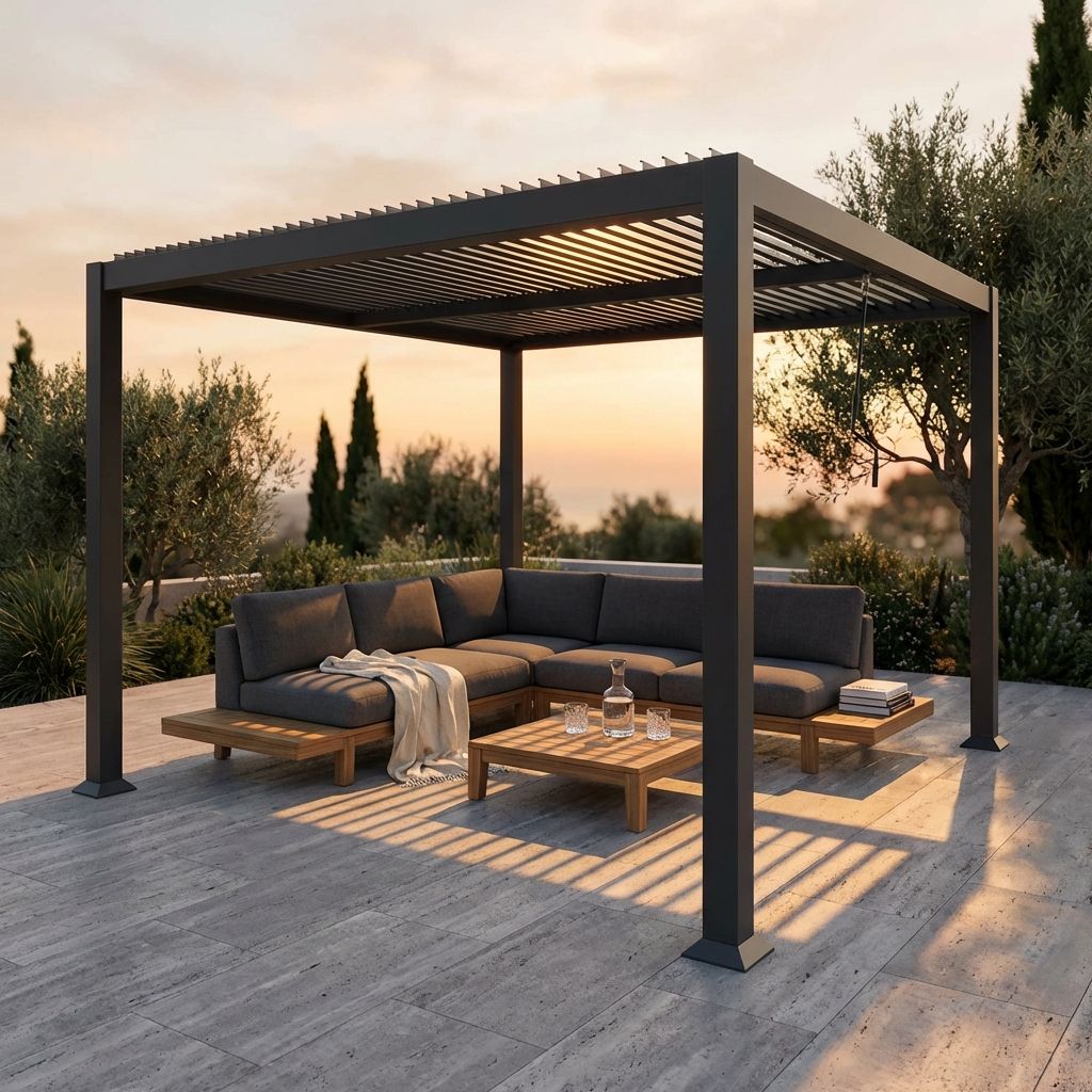 Pergola bioclimatica, una soluzione moderna e raffinata per il tuo spazio esterno. Con lamelle orientabili per un perfetto controllo del clima, è l'ideale per tutti coloro che desiderano un ambiente esterno versatile e confortevole, disponibile in colore bianco e antracite, e in dimensioni 3x3 m, 3x4 m e 4x4 m.