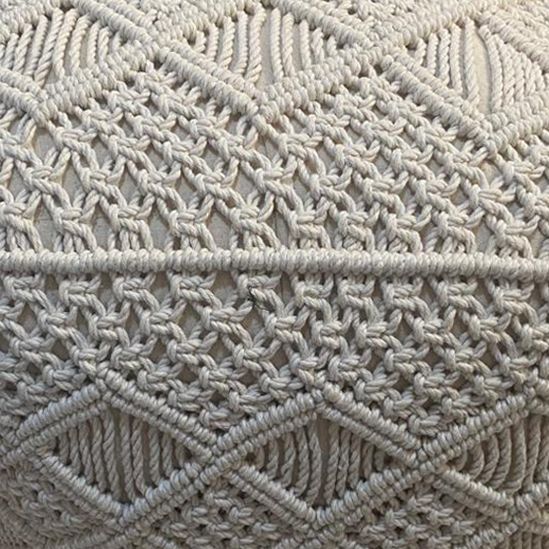 Pouf in cotone con motivo in macramè per un tocco boho-chic e naturale in ogni ambiente. Funzionale come seduta, poggiapiedi o elemento decorativo, combina estetica e praticità.
