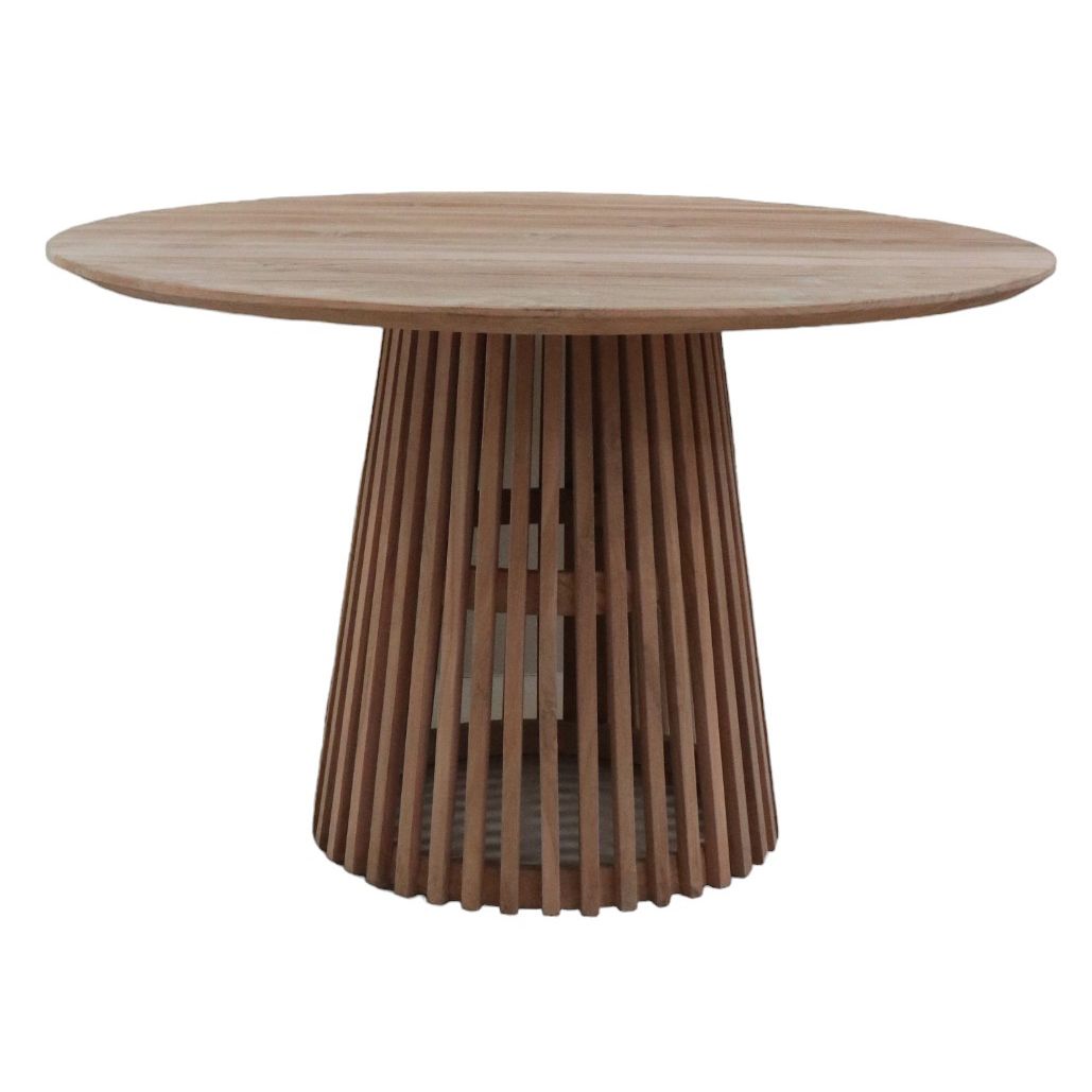 Tavolo rotondo in teak con base centrale a listelli dal design moderno e scenografico. Solido, resistente e ideale per ambienti indoor o outdoor coperti, offre un’ampia superficie per momenti conviviali. Il legno naturale valorizza ogni spazio con eleganza e calore.