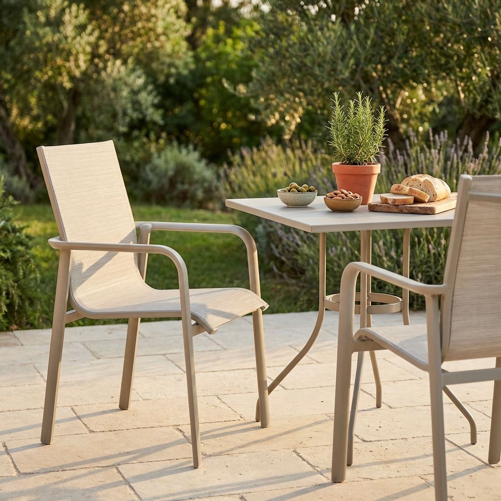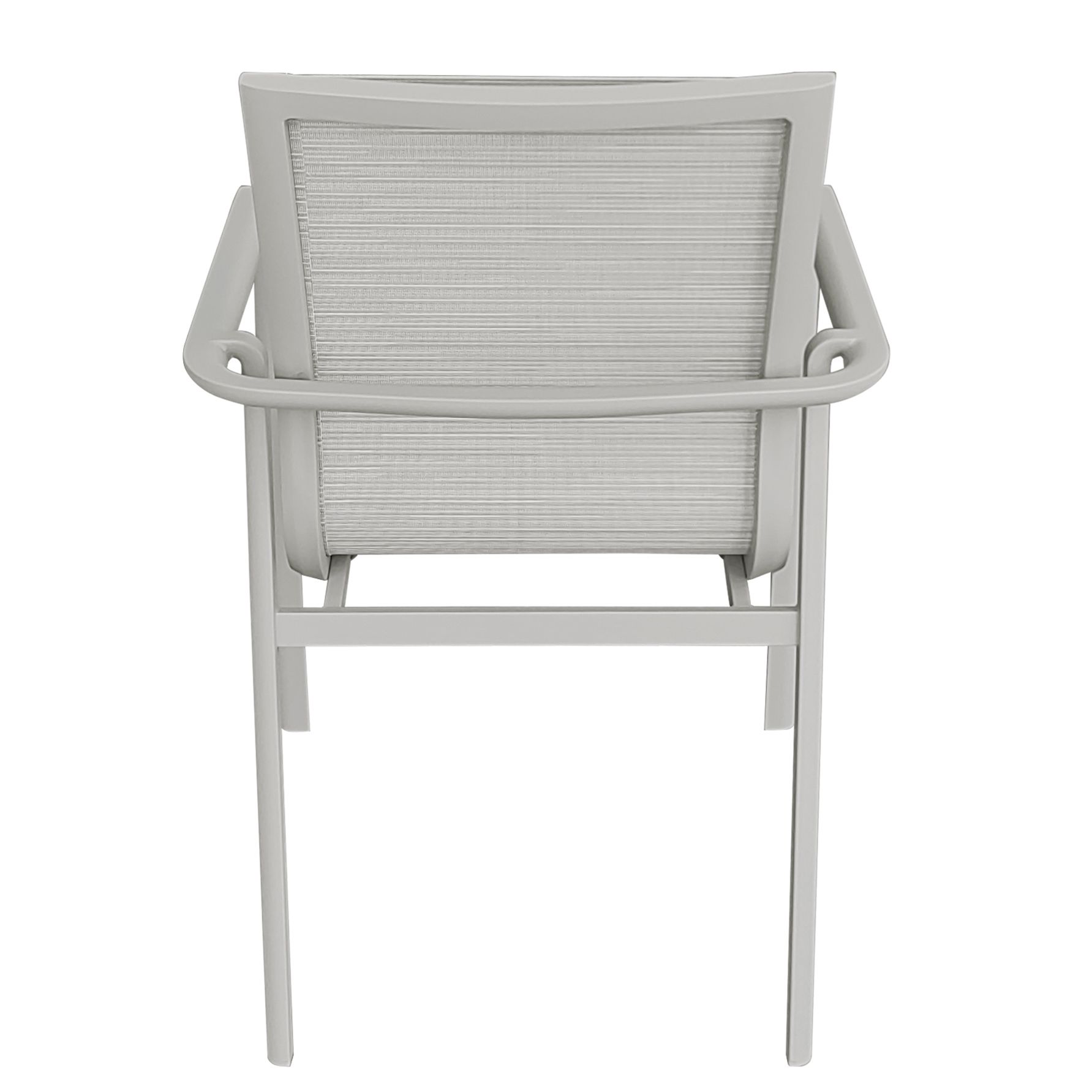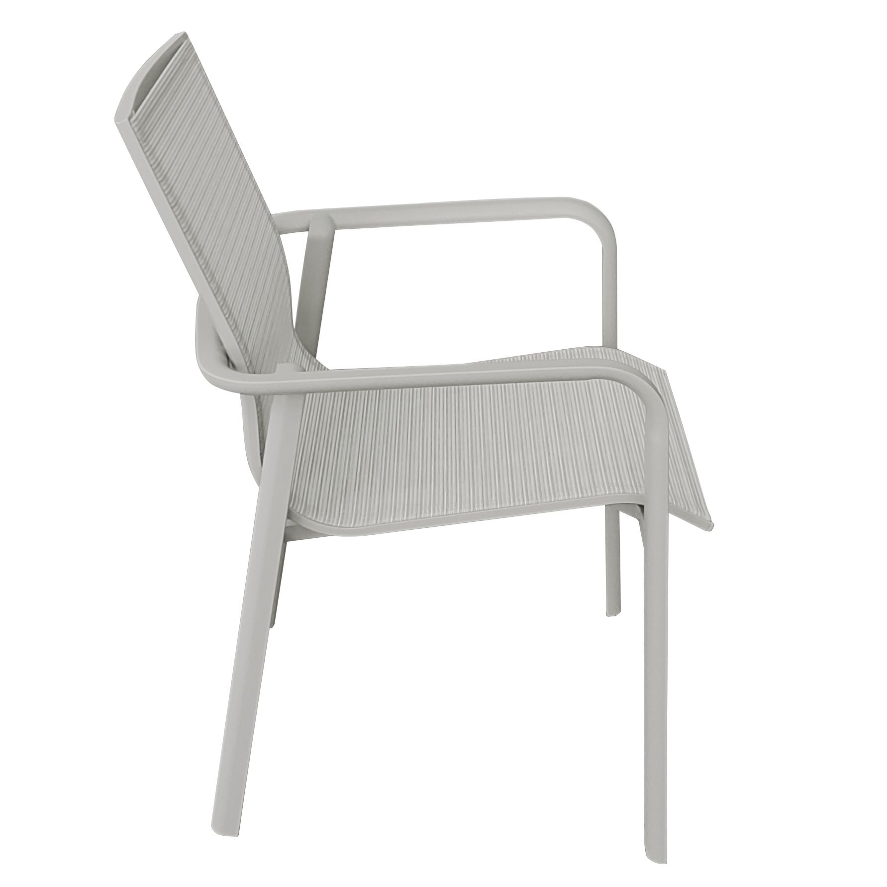 Poltrona in alluminio monoblocco con seduta e schienale in textilene. Disponibile nei colori grigio sabbia e gesso, unisce eleganza e comfort in un design moderno, resistente e leggero. Ideale per arredare con stile terrazze, giardini e spazi contract.