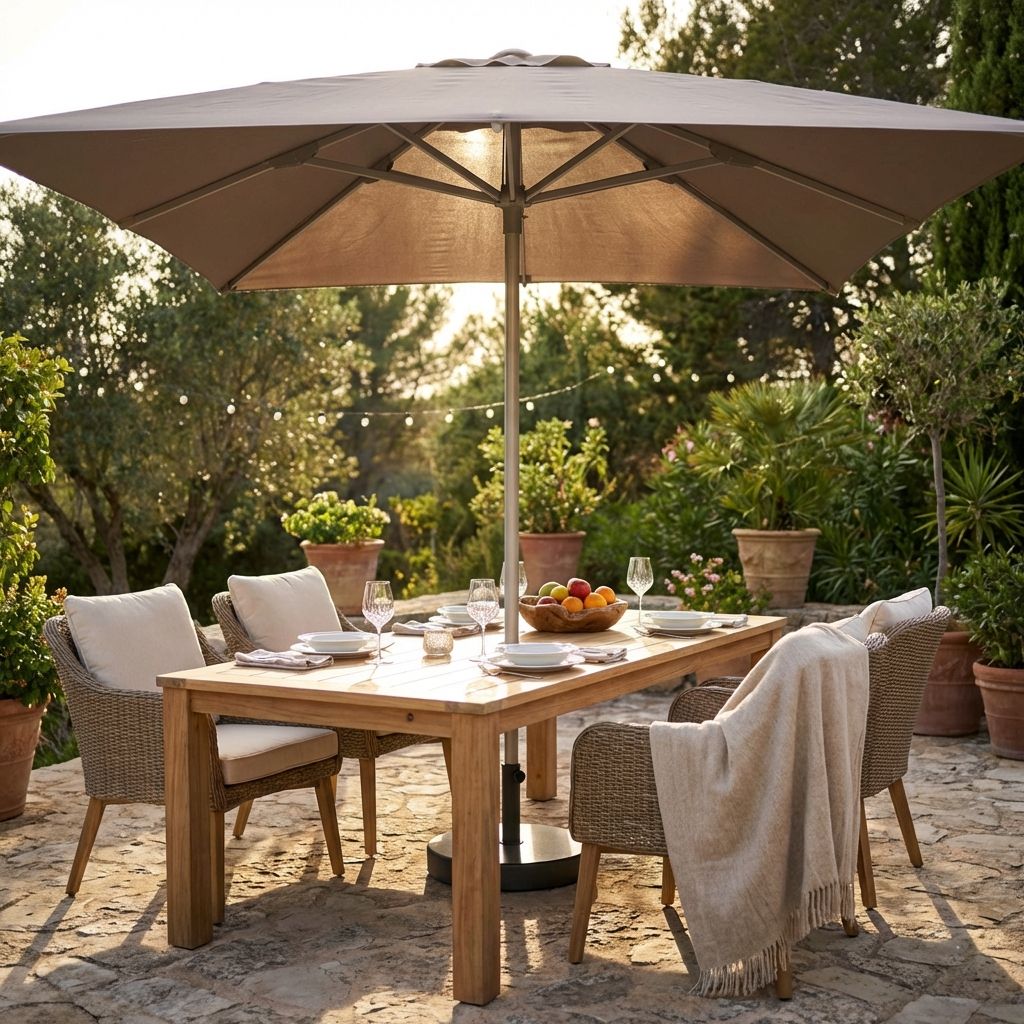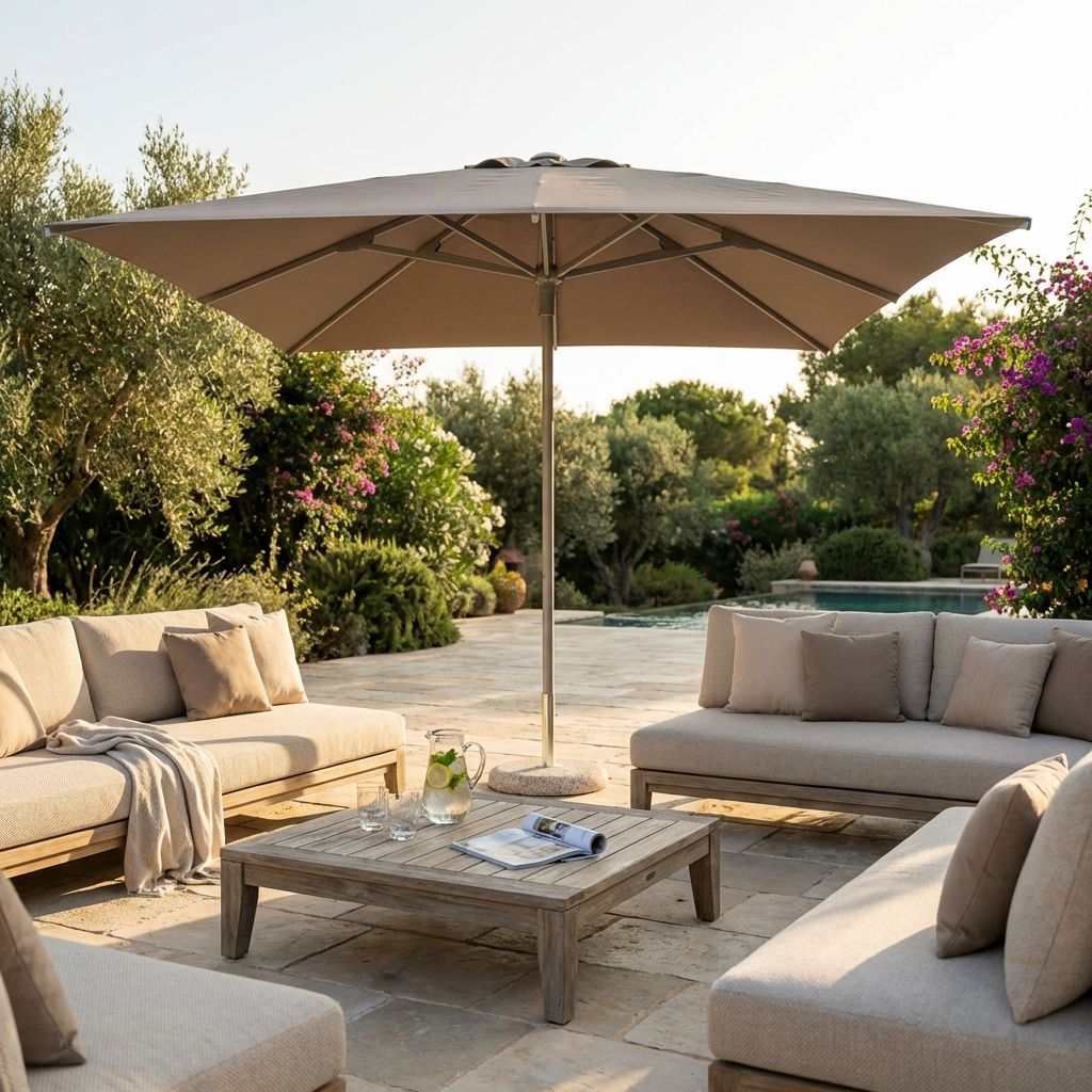 Ombreggia e decora il tuo spazio esterno con il nostro ombrellone con palo centrale, disponibile con telo beige, bianco o taupe o grigio. Unisce durabilità, design e praticità per la massima comodità sotto il sole.