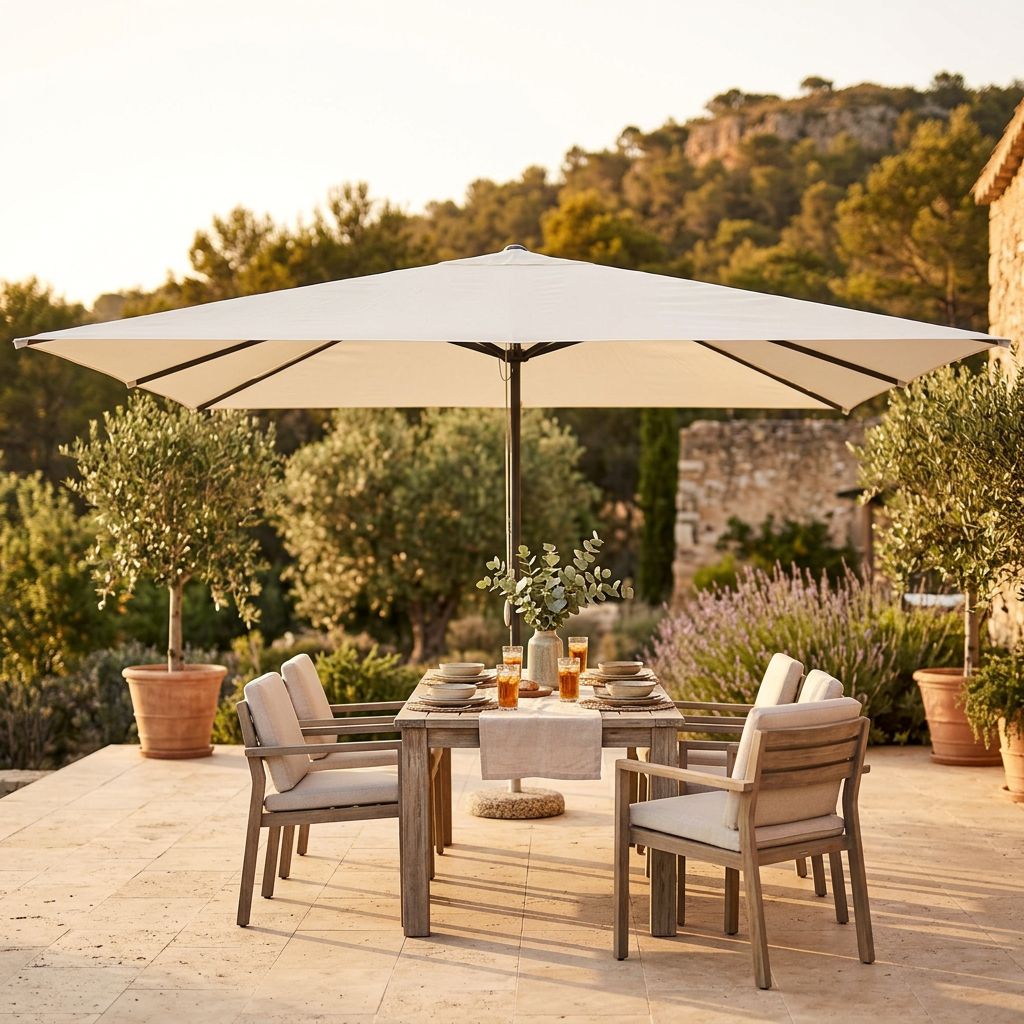 Ombreggia e decora il tuo spazio esterno con il nostro ombrellone con palo centrale, disponibile con telo beige, bianco o taupe o grigio. Unisce durabilità, design e praticità per la massima comodità sotto il sole.
