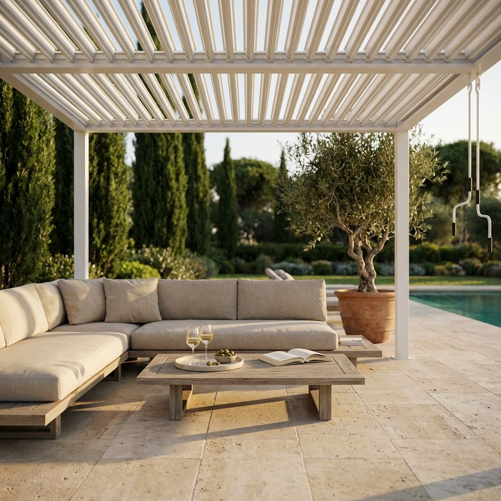 LAMELLE ORIENTABILI: il tetto bioclimatico regola luce e ventilazione con un semplice gesto, aiutando a creare ombra e comfort in ogni momento della giornata.