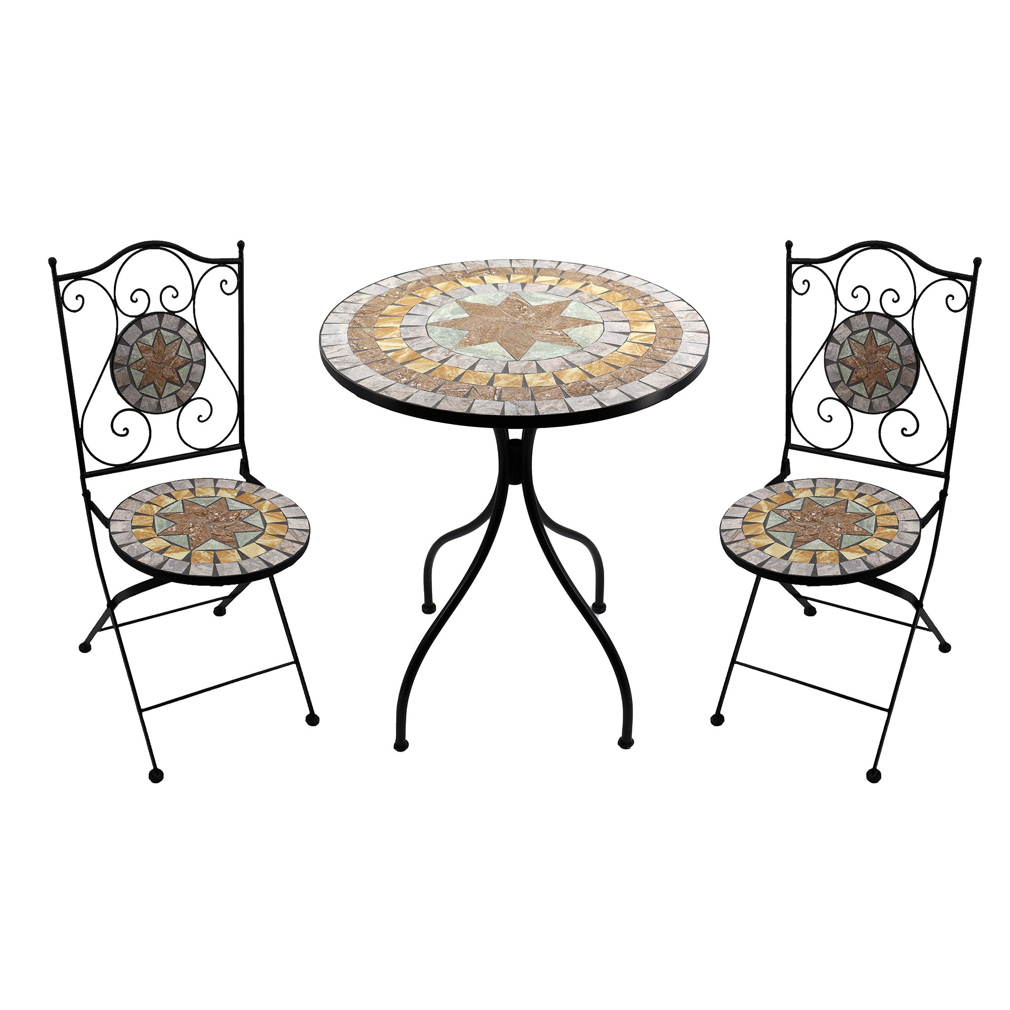 Elegante set da esterno con tavolo rotondo e due sedie pieghevoli in metallo con verniciatura a polvere. Il piano del tavolo e le sedute sono decorati con splendide piastrelle in vari stili e colori. Perfetto per terrazzi, giardini e balconi, unisce resistenza e raffinatezza per un’atmosfera romantica e accogliente.