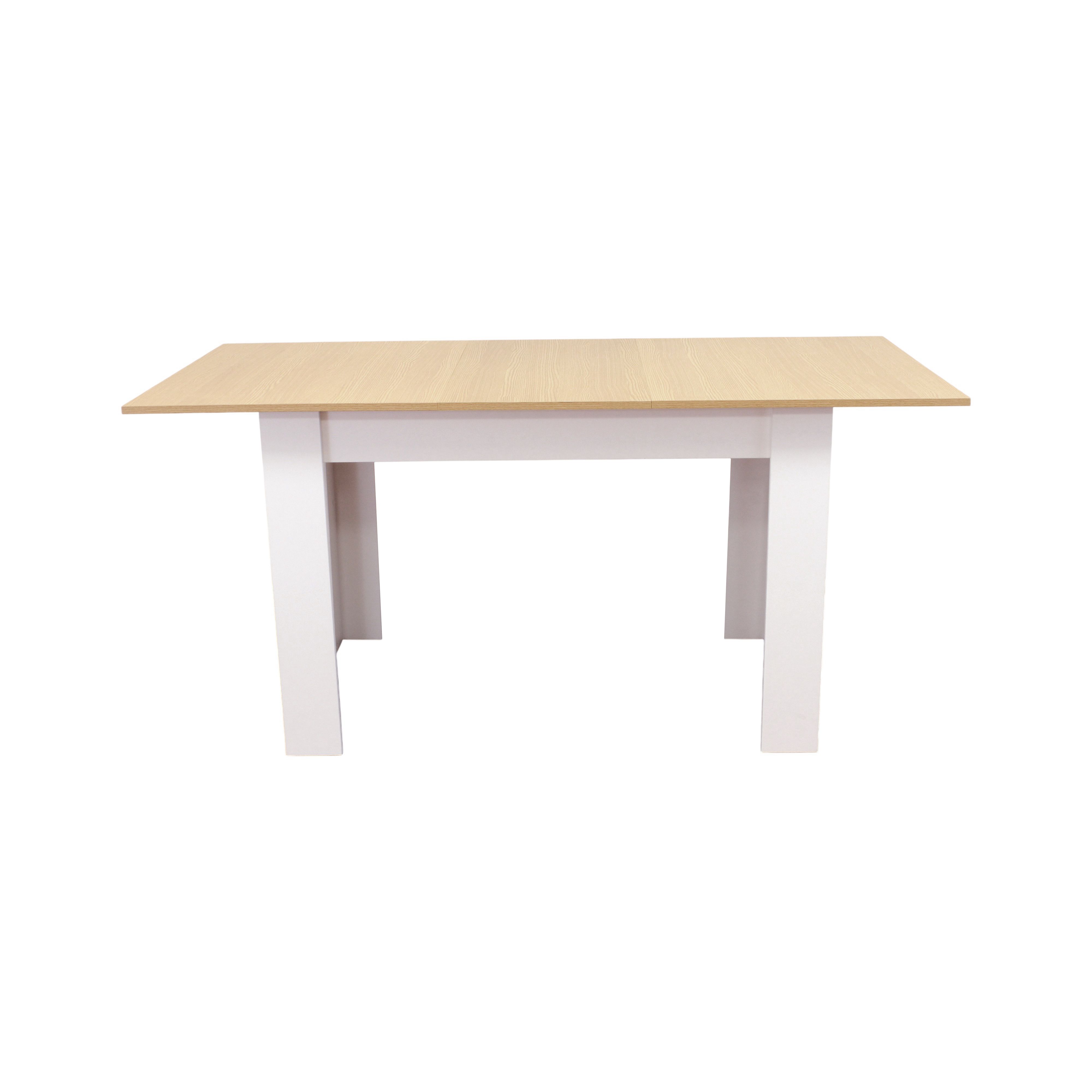 Tavolo in pannello truciolare con gambe bianche e piano effetto legno naturale. Elegante e funzionale, offre stabilità e ampio spazio per pranzi, cene e attività quotidiane. Facile da inserire in cucina o soggiorno, unisce stile moderno e praticità in un unico arredo versatile.