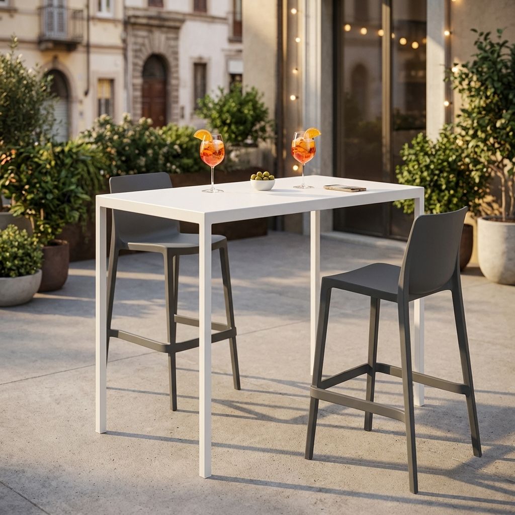 Tavolo alto (110 cm) per uso contract, 110x60 cm in metallo, ideale per bar, ristoranti, terrazze e spazi professionali. Struttura solida e resistente con sistema autolivellante per garantire stabilità anche su superfici irregolari. Design essenziale e moderno. Disponibile nei colori bianco e antracite.