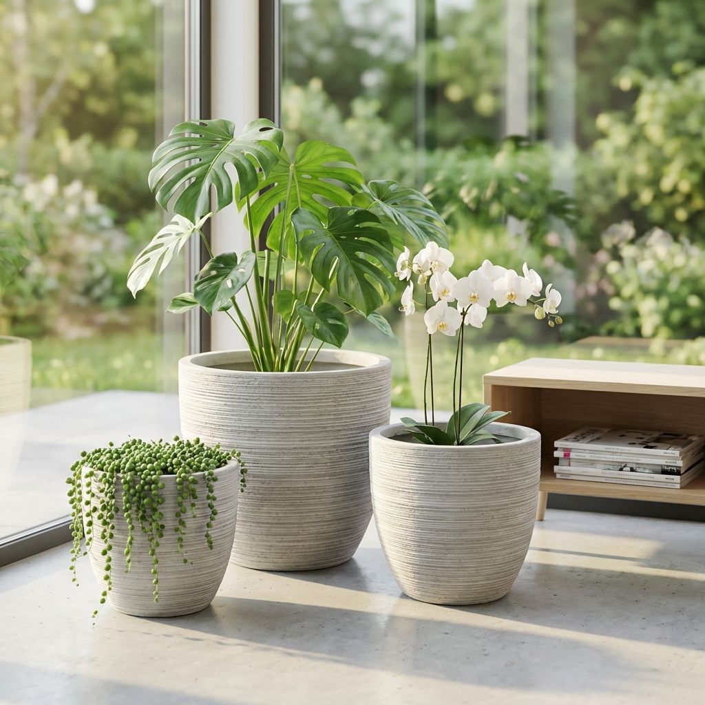 Con la collezione NURIA, potrete rendere ogni angolo della vostra casa perfettamente abbinato ad ogni periodo dell'anno. I vasi in fibra di argilla grigio chiaro del set small si sposano alla perfezione con fiori di ogni tipo, creando un incantevole sfondo per la vostra stanza. Questo set di 3 vasi NURIA è una combinazione subtile di eleganza e stile, grazie al suo design semplice e versatile che si adatta facilmente a qualsiasi ambiente, sia interno che esterno.