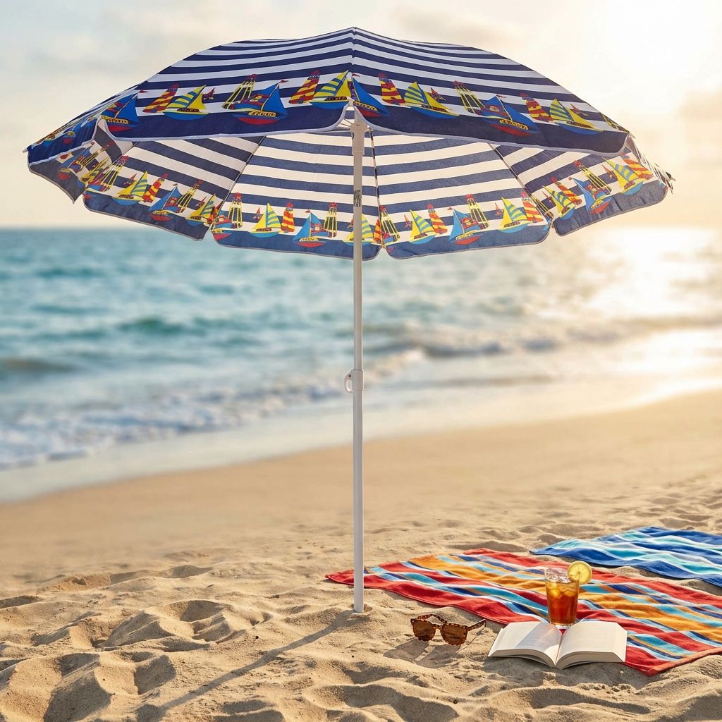 Quest'estate, non farti trovare impreparato sotto il sole cocente: prendi questo fantastico ombrellone da spiaggia! Robusto palo in acciaio per la massima stabilità, inclinabile per trovare l'ombra perfetta. La resistente tela di nylon, impermeabile e anti-UV, ti proteggerà con stile! Con questo ombrellone, vivrai momenti indimenticabili in spiaggia!
