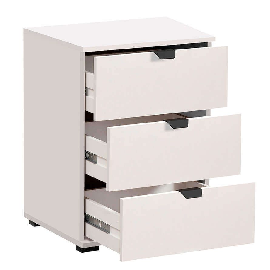 La cassettiera moderna ONE è disponibile in tre colori: bianco, rovere chiaro e rovere grigio.