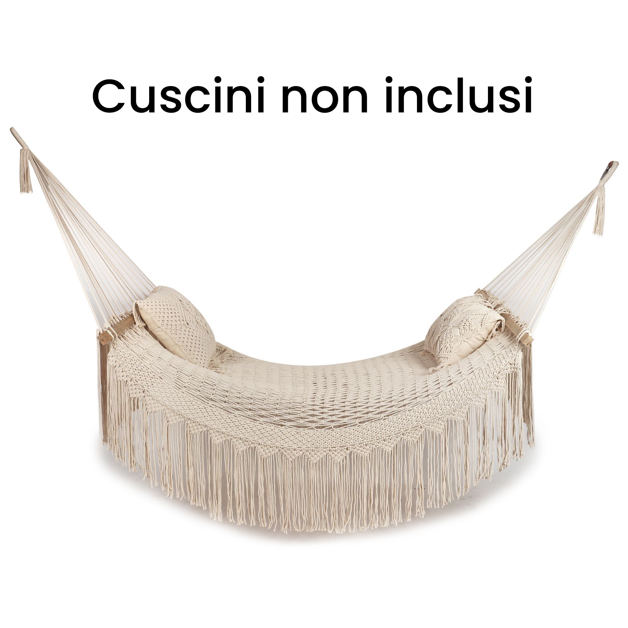 Lasciati cullare da un equilibrio perfetto tra natura e artigianato con questa meravigliosa amaca in cotone intrecciato e legno di acacia, pensata per trasformare ogni angolo in un rifugio di puro benessere. Il corpo dell’amaca è realizzato in morbido cotone intrecciato in una rete fitta ma ariosa, che si adatta dolcemente al corpo avvolgendolo in un abbraccio leggero. I dettagli in legno di acacia, resistente e caldo, donano un tocco di eleganza rustica e autenticità, mentre le lunghe frange danzano con la brezza, creando un effetto visivo rilassante e armonioso. Questa amaca non è solo un complemento d’arredo, ma un invito a rallentare, a ritagliarsi un momento per sé stessi, a riscoprire il piacere delle piccole cose. Perfetta per un portico, un giardino ombreggiato o anche un grande soggiorno luminoso, si integra facilmente in ambienti boho, naturali o contemporanei, portando con sé un senso di leggerezza e serenità. Perché nella frenesia del quotidiano, questa amaca ti ricorda che il vero lusso è prendersi il tempo di non fare nulla, sospesi tra cielo e terra, cullati da bellezza e silenzio.