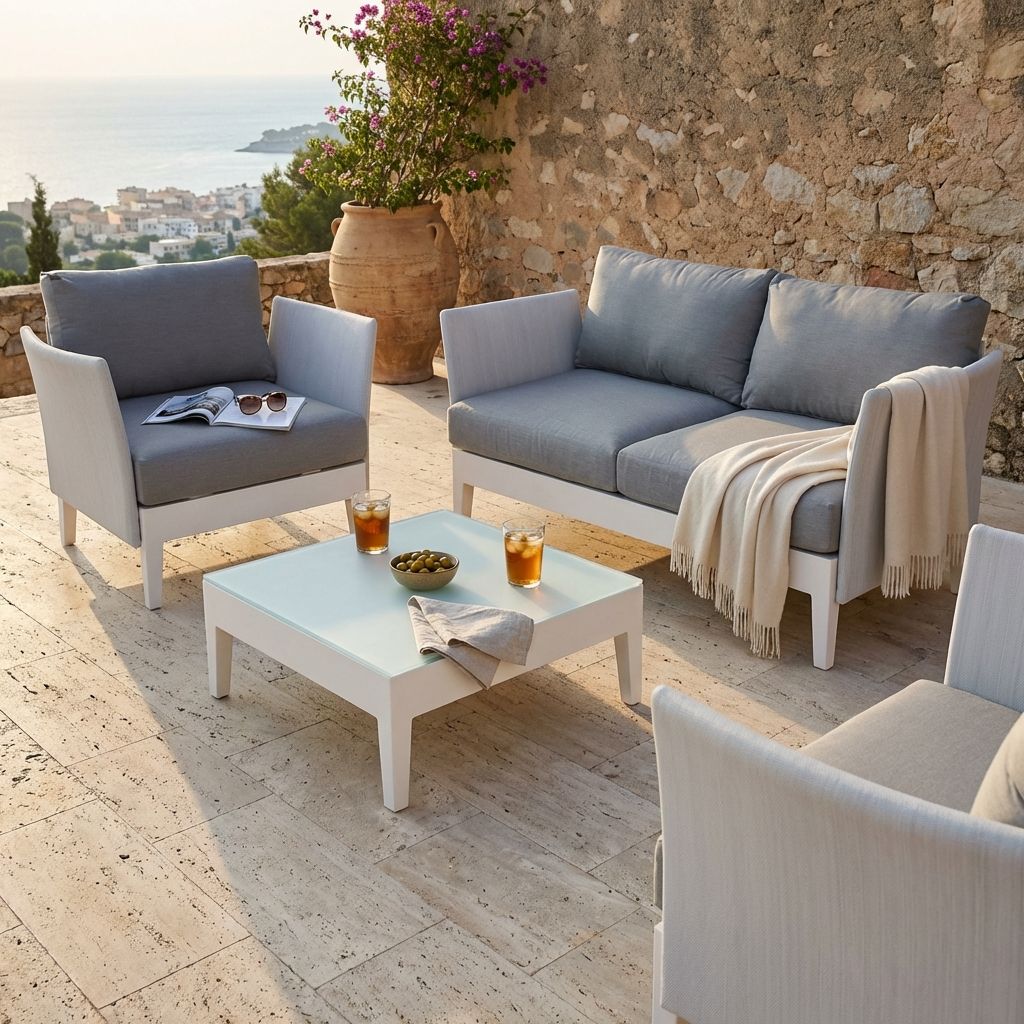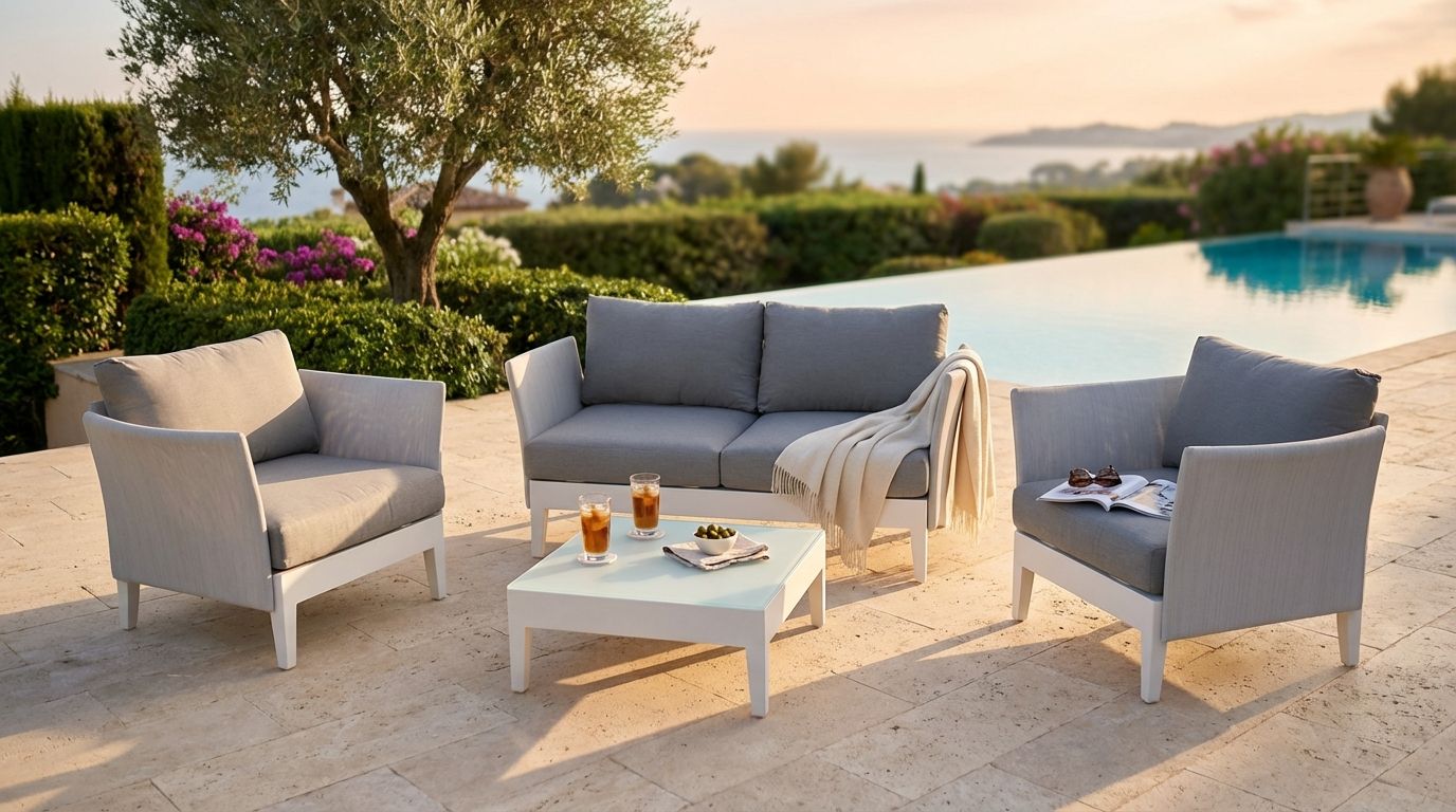 OPUS è il nostro salotto raffinato e sinuoso con struttura in alluminie e poggiabraccio rivestiti in textilene opzionabile in 2 diverse versione 4 o 5 posti