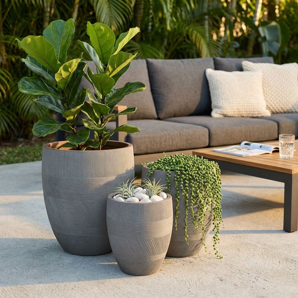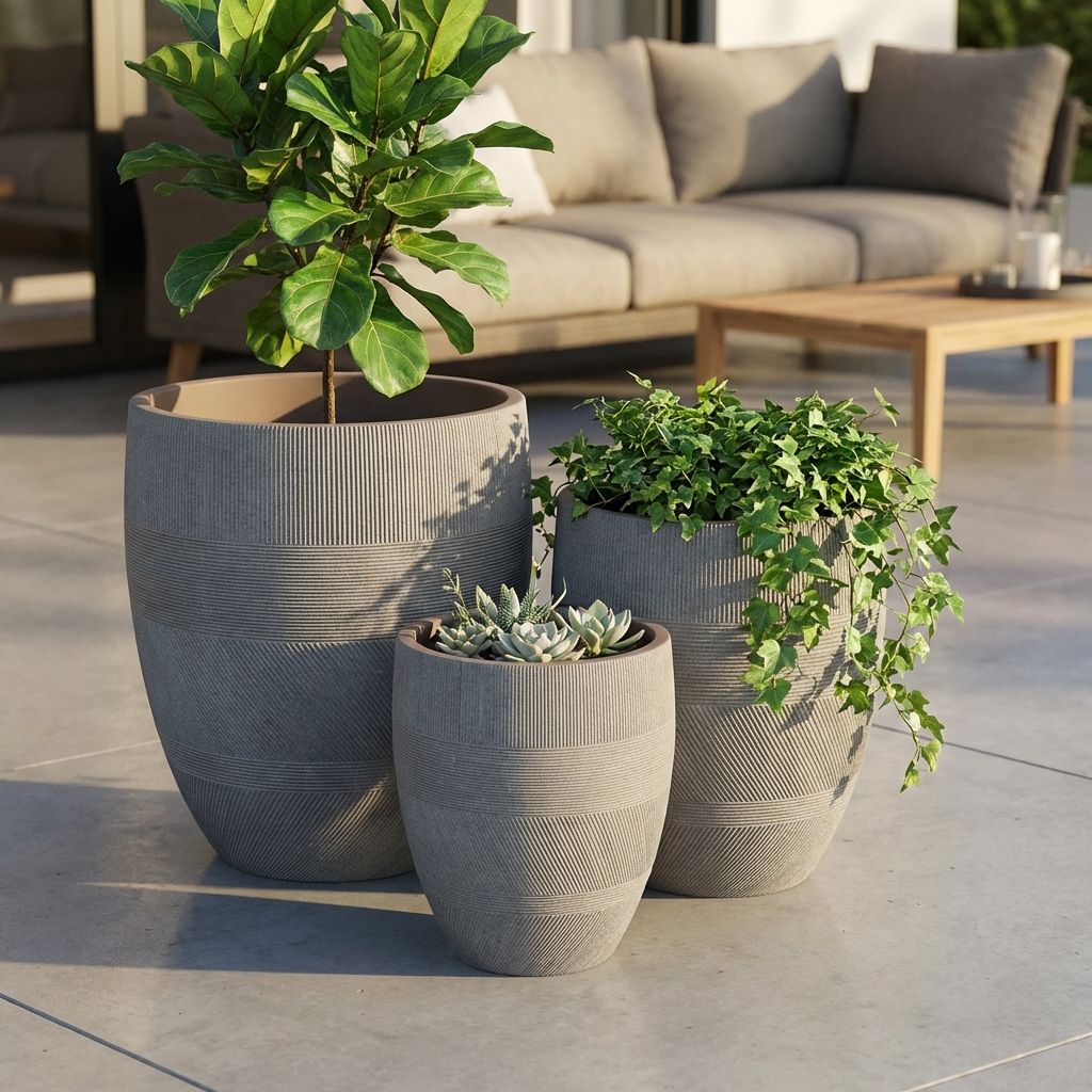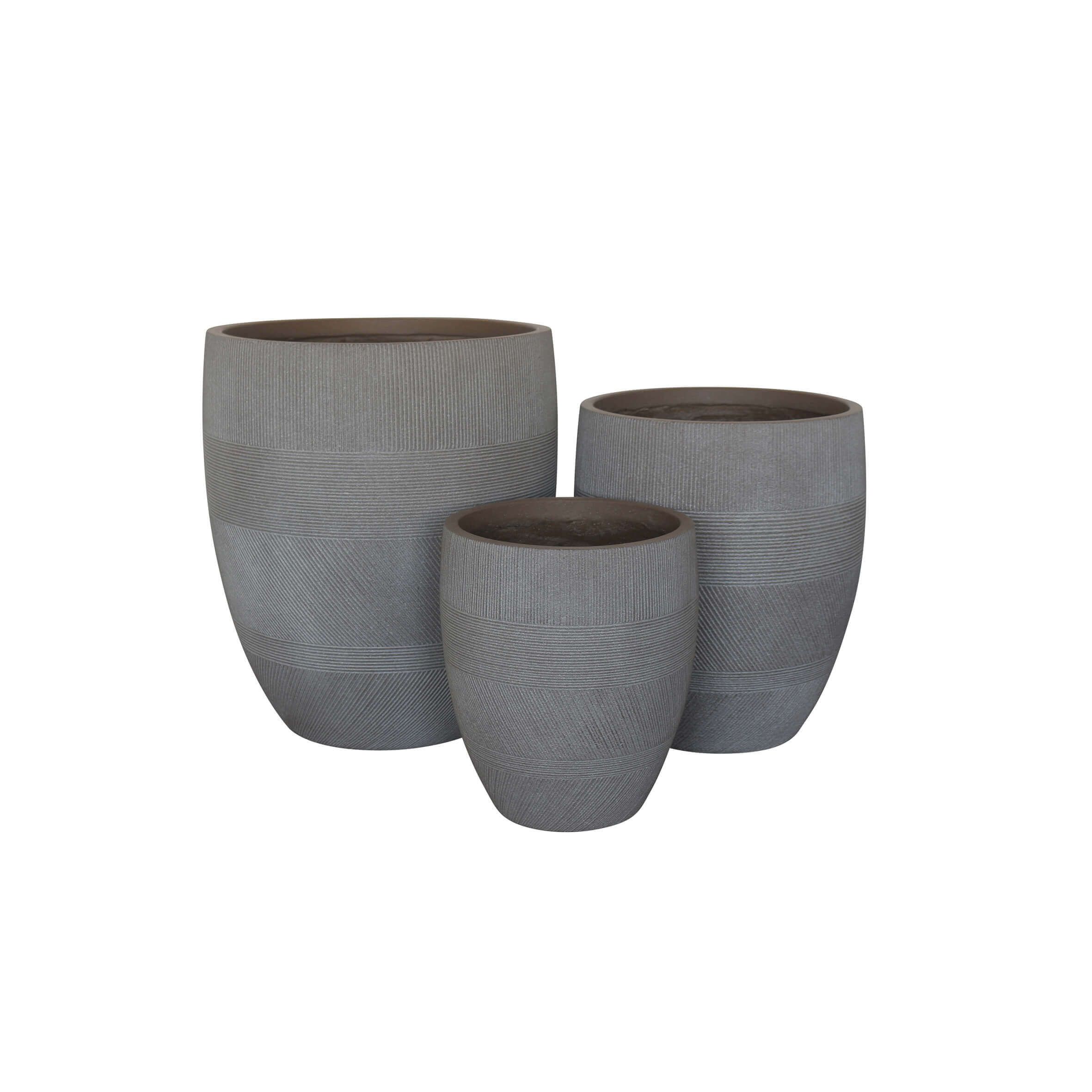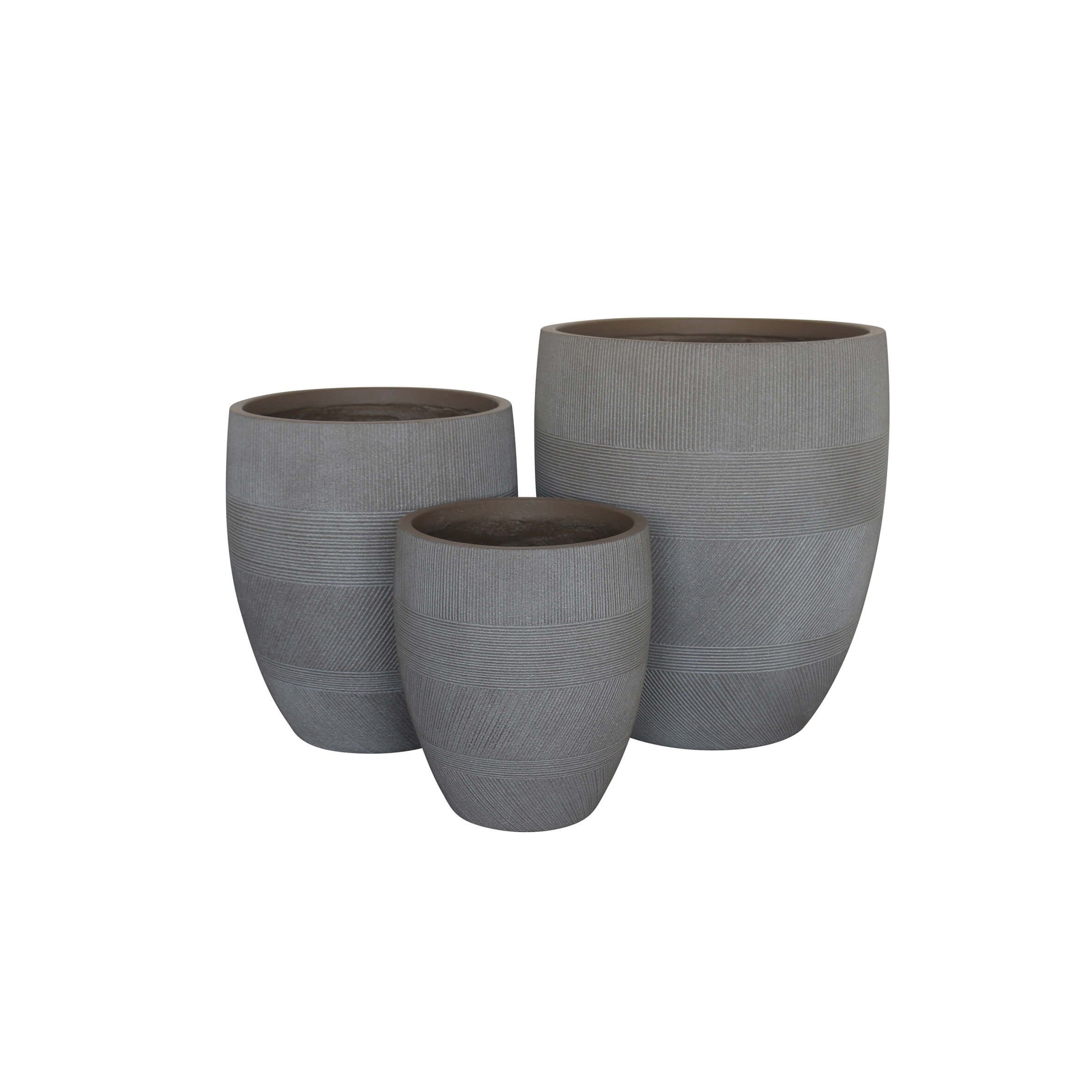 PEDRO è un set di 3 vasi grigi in fibra di argilla, creato in modo sostenibile senza solventi tossici. Leggeri, resistenti e sicuri, sono la soluzione perfetta per abbellire il tuo spazio interno o esterno. Aggiungili al tuo arredamento e guarda la tua casa trasformarsi!