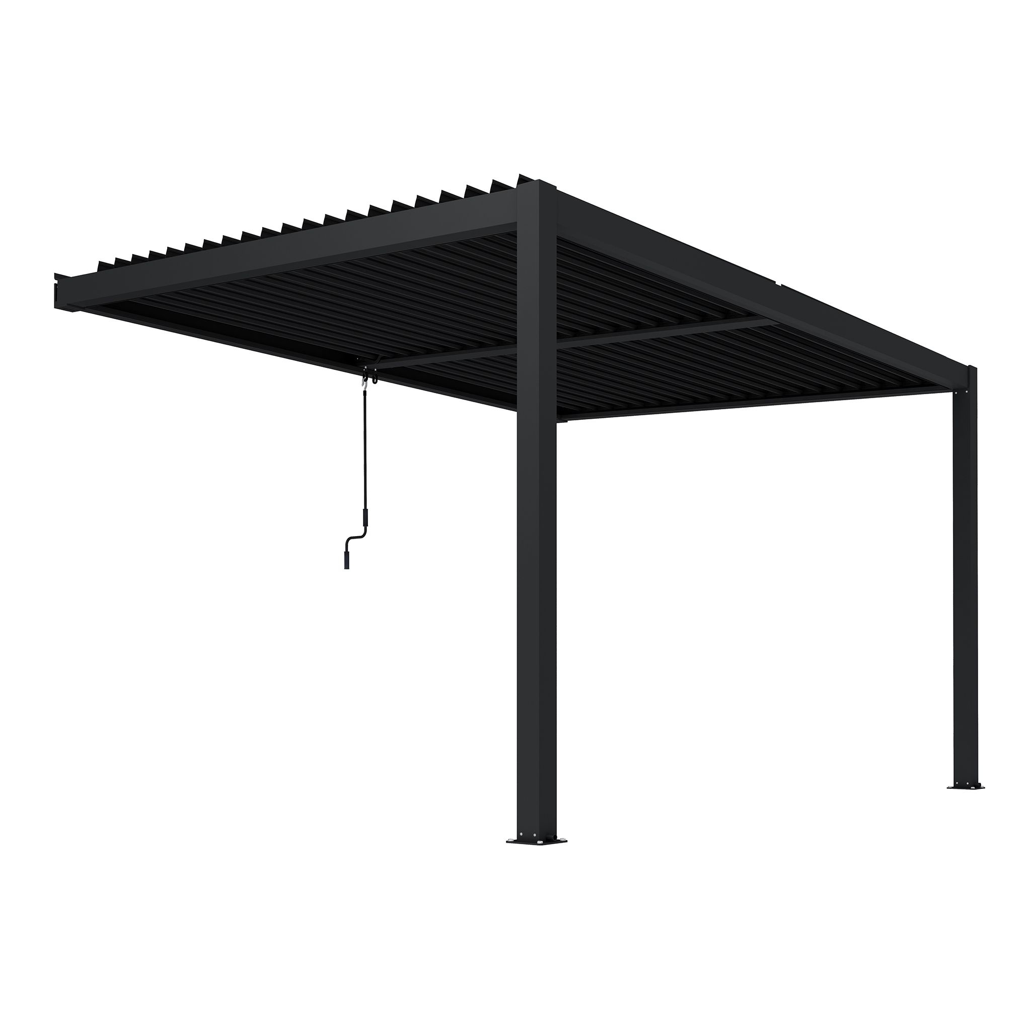Pergola addossata in alluminio con lamelle orientabili manualmente tramite manovella. Struttura solida e dal design essenziale, ideale per modulare luce e ombra in terrazze e giardini. Elegante, resistente, perfetta per vivere l’outdoor in ogni stagione.