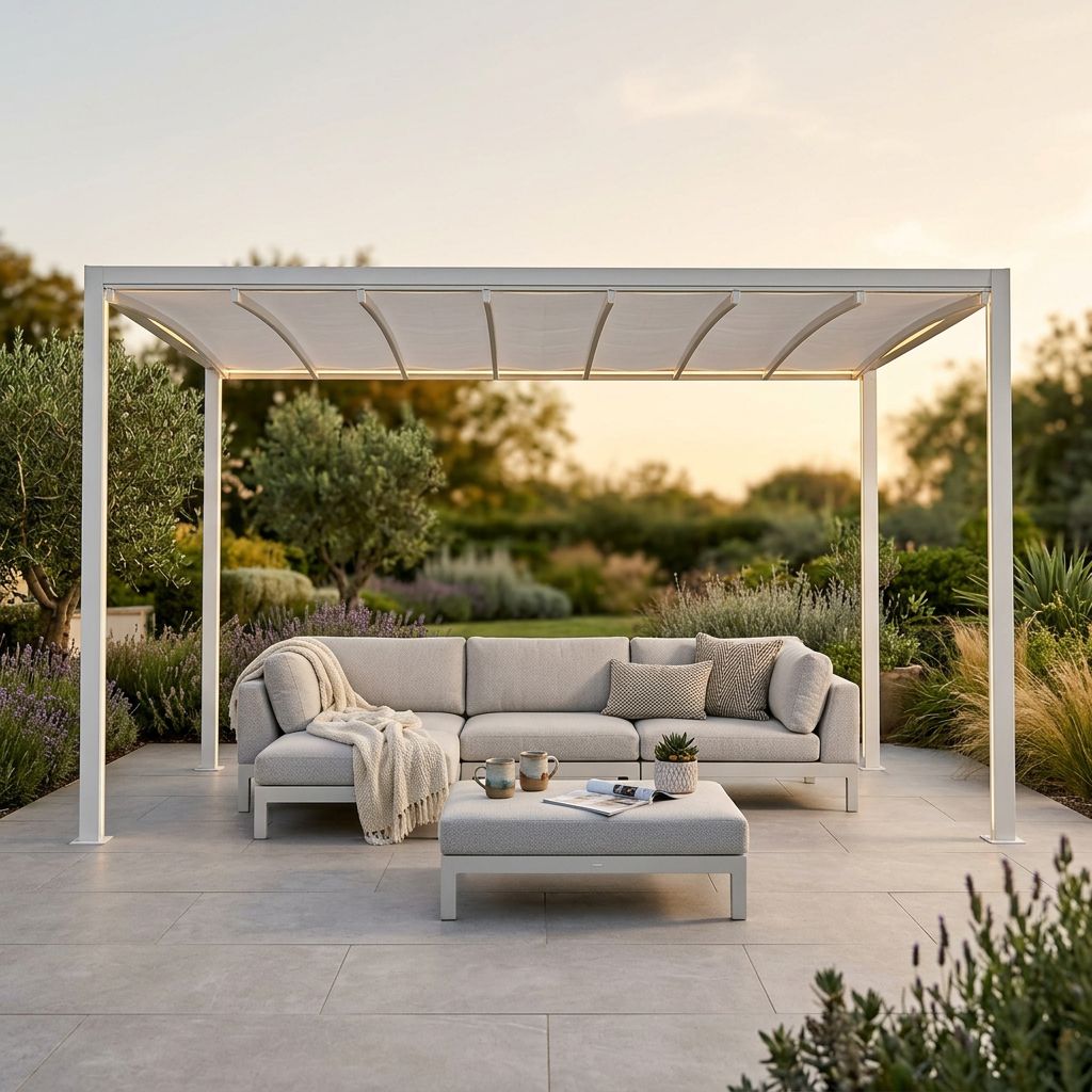 Pergola retrattile motorizzata con struttura in alluminio e copertura in PVC ad apertura elettrica. Dotata di luci LED integrate, unisce eleganza e comfort per vivere lo spazio esterno in ogni momento della giornata, con protezione e stile.