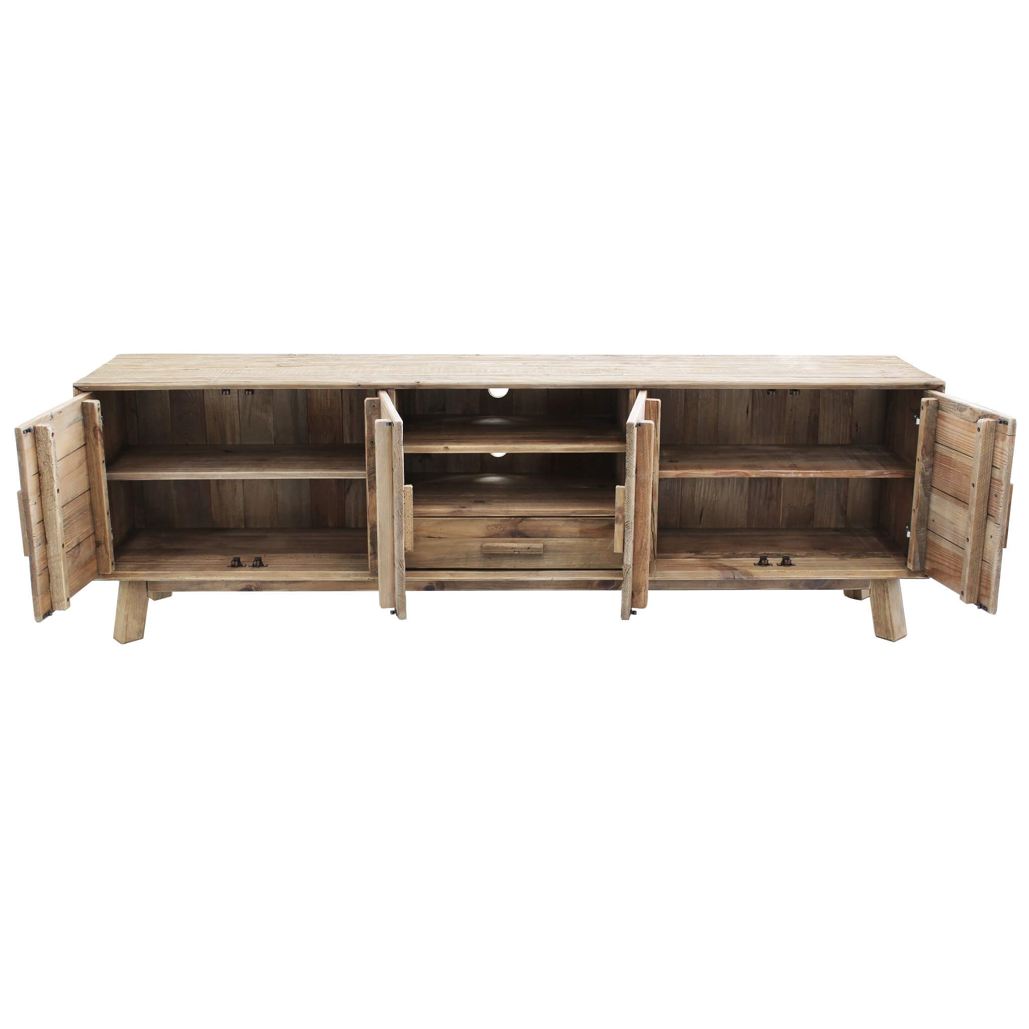 Fin dall'ingresso in casa, si percepisce il suo stile distintivo: un look semplice e naturale che si integra invece di risaltare. Il segreto è l'uso di legno di pino riciclato, che gli conferisce una consistenza accattivante e un colore caldo. Questo mobile TV è dotato di 4 ante che si aprono per rivelare 1 cassetto e 2 ripiani per tutti i componenti multimediali.