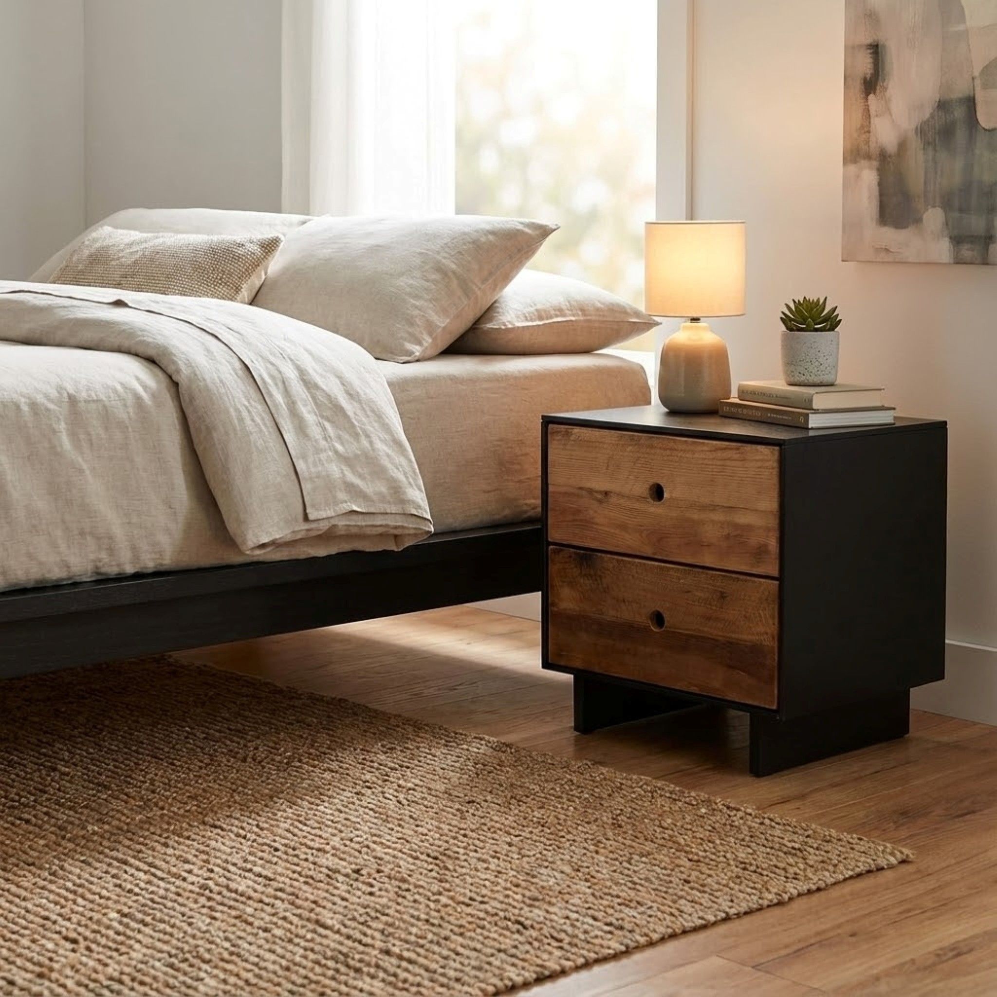 Se stai cercando il massimo del minimalismo per la tua camera da letto, il comodino PINUS BLACK è ciò che fa per te! Con il suo design semplice e lineare, completato dai cassetti in legno naturale e dalla struttura nera, donerà un tocco unico alla tua stanza. Non potrai fare a meno di rimanere stupefatto dalla sua bellezza! Inoltre, il legno utilizzato per i cassetti è pino riciclato, quindi anche molto ecosostenibile. E cosa dire dei fori circolari al posto delle classiche maniglie? Un dettaglio minimalista che aggiunge un tocco di pulizia al design del comodino. Scegli PINUS BLACK per un tocco di eleganza minimalista nella tua camera da letto.