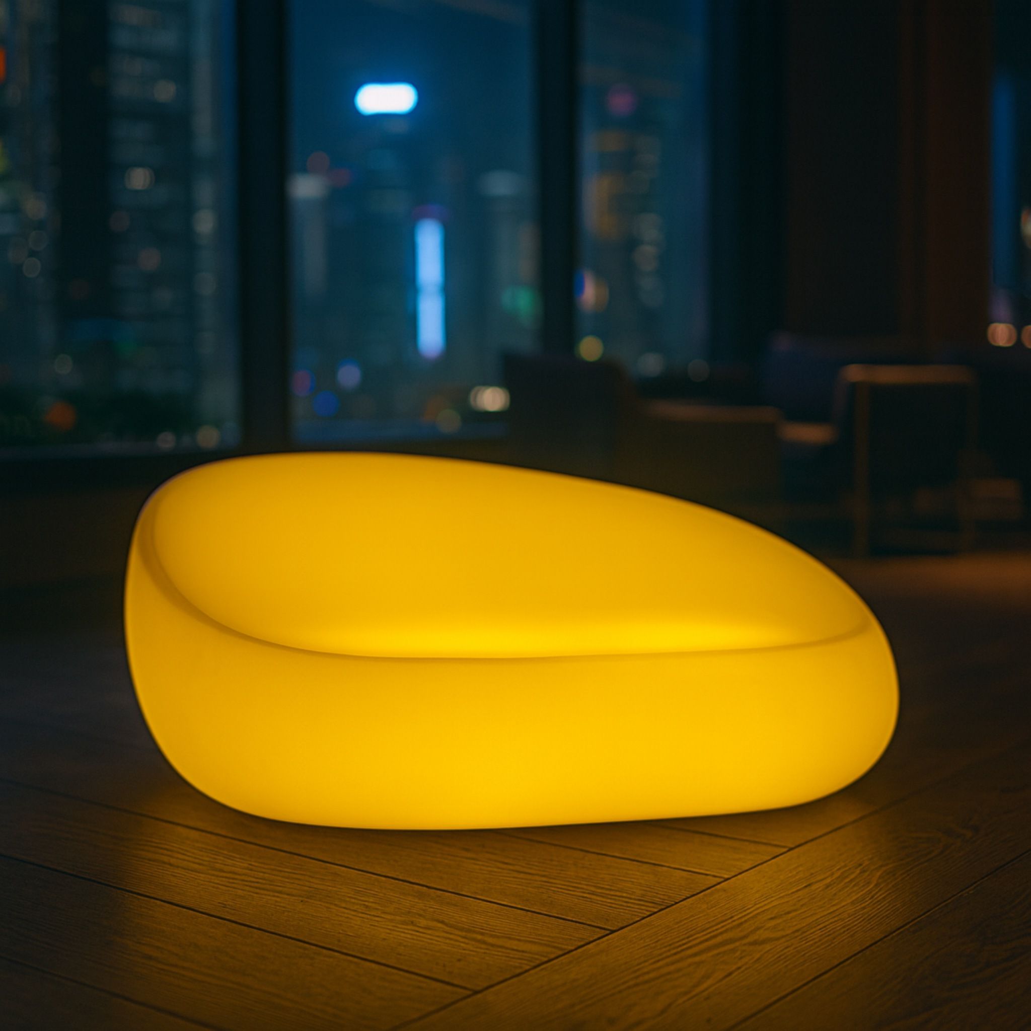 Divano luminoso dal design moderno e avvolgente. Dotato di illuminazione regolabile con oltre 30 tonalità di colore, permette di creare atmosfere sempre diverse, dal relax alla convivialità. Struttura resistente, luce uniforme e forte impatto scenografico lo rendono perfetto per terrazze, giardini ed eventi.