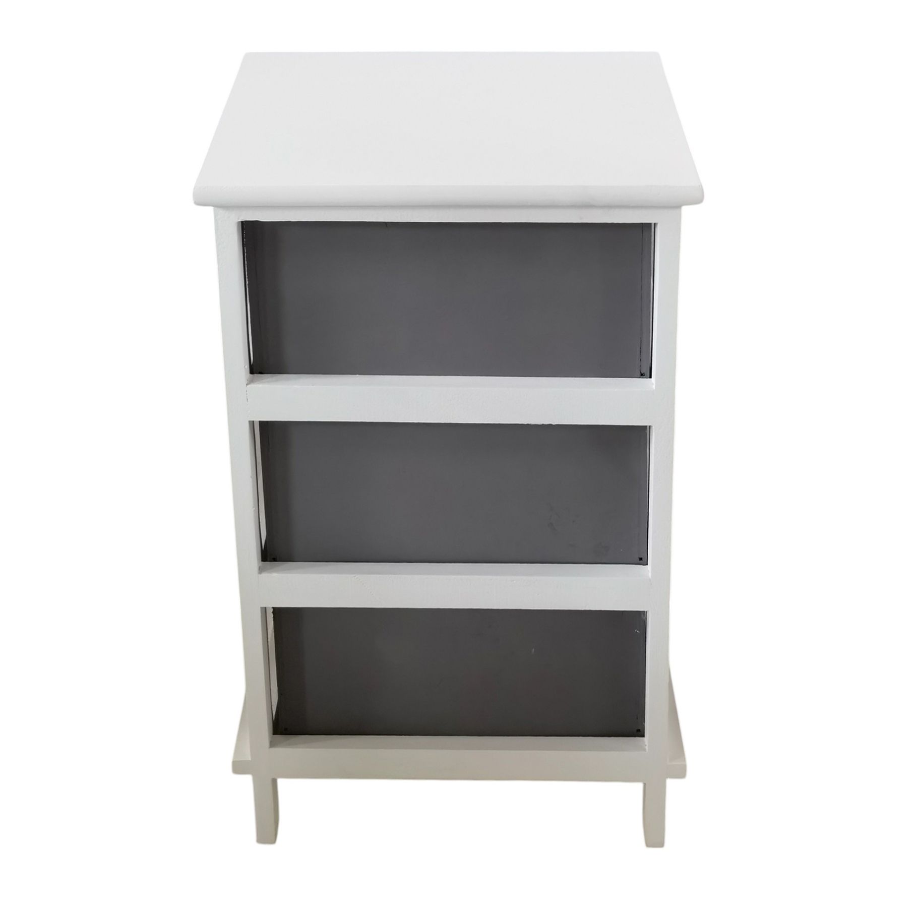 Mobiletto in legno dal design shabby chic, con struttura bianca e cassetti grigi. Perfetto per camera, soggiorno, bagno o ingresso, unisce funzionalità e stile vintage. Struttura compatta e leggera, dispone di tre ampi cassetti con pomelli bianchi.