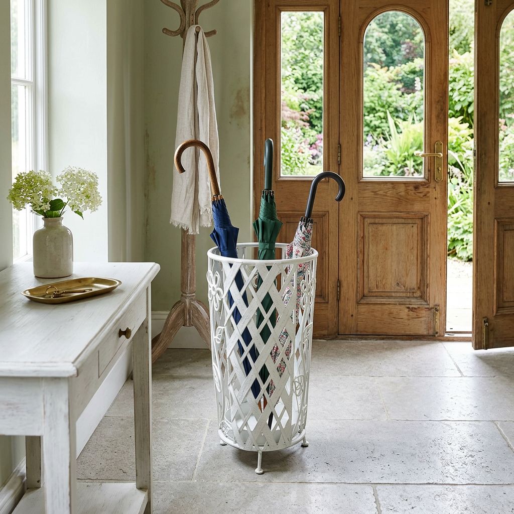 Il portaombrelli Shabby Chic da interno e esterno, adatto a ombrelli di ogni tipo, con intagli utili anche come ganci, unisce funzionalità a design, tenendo la pioggia fuori e aggiungendo un tocco di stile.