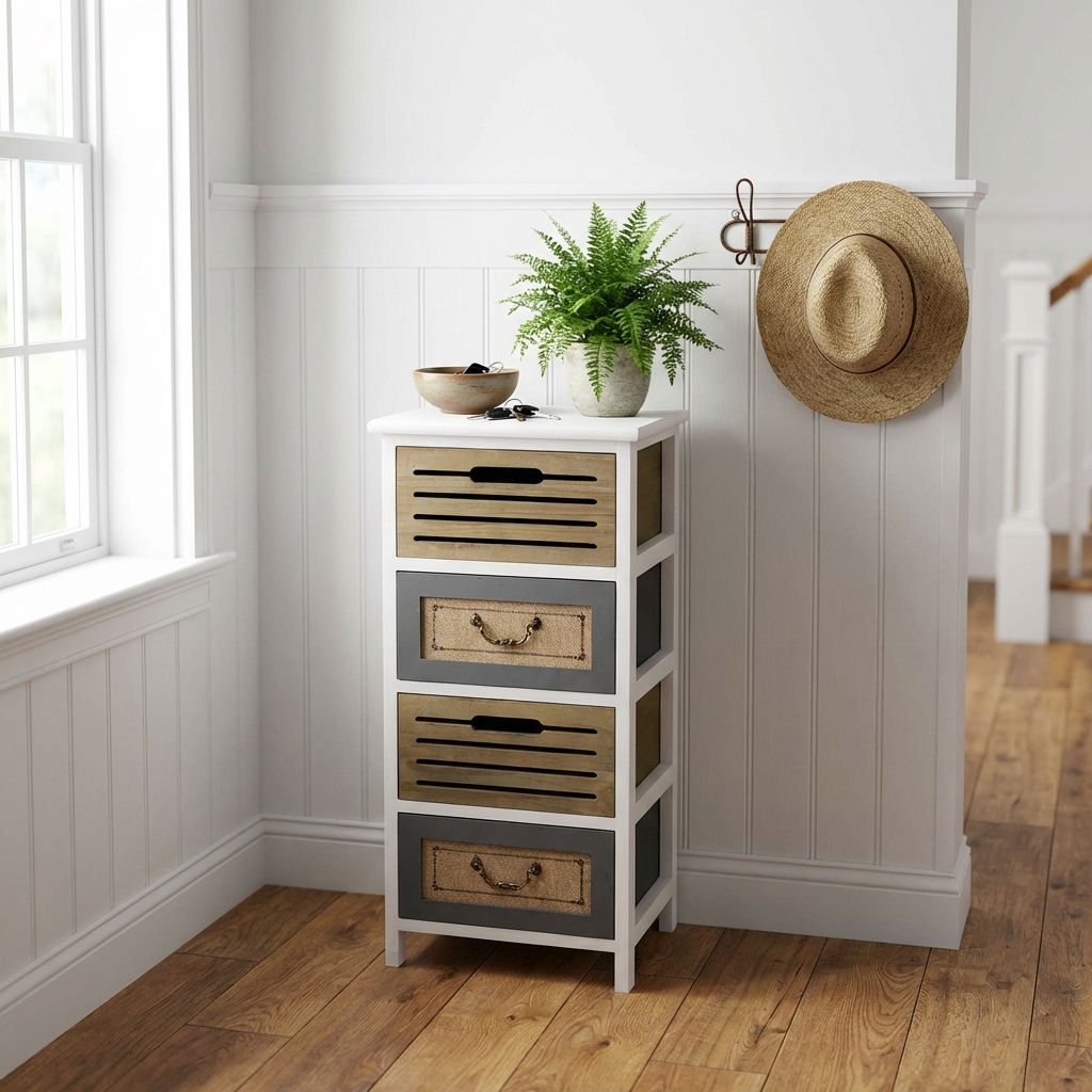 Mobiletto in legno con 4 cassetti, struttura bianca e cassetti con dettagli in juta e maniglie retrò. Perfetto per organizzare e decorare qualsiasi ambiente, ideale per camere, ingressi o soggiorni in stile shabby chic.