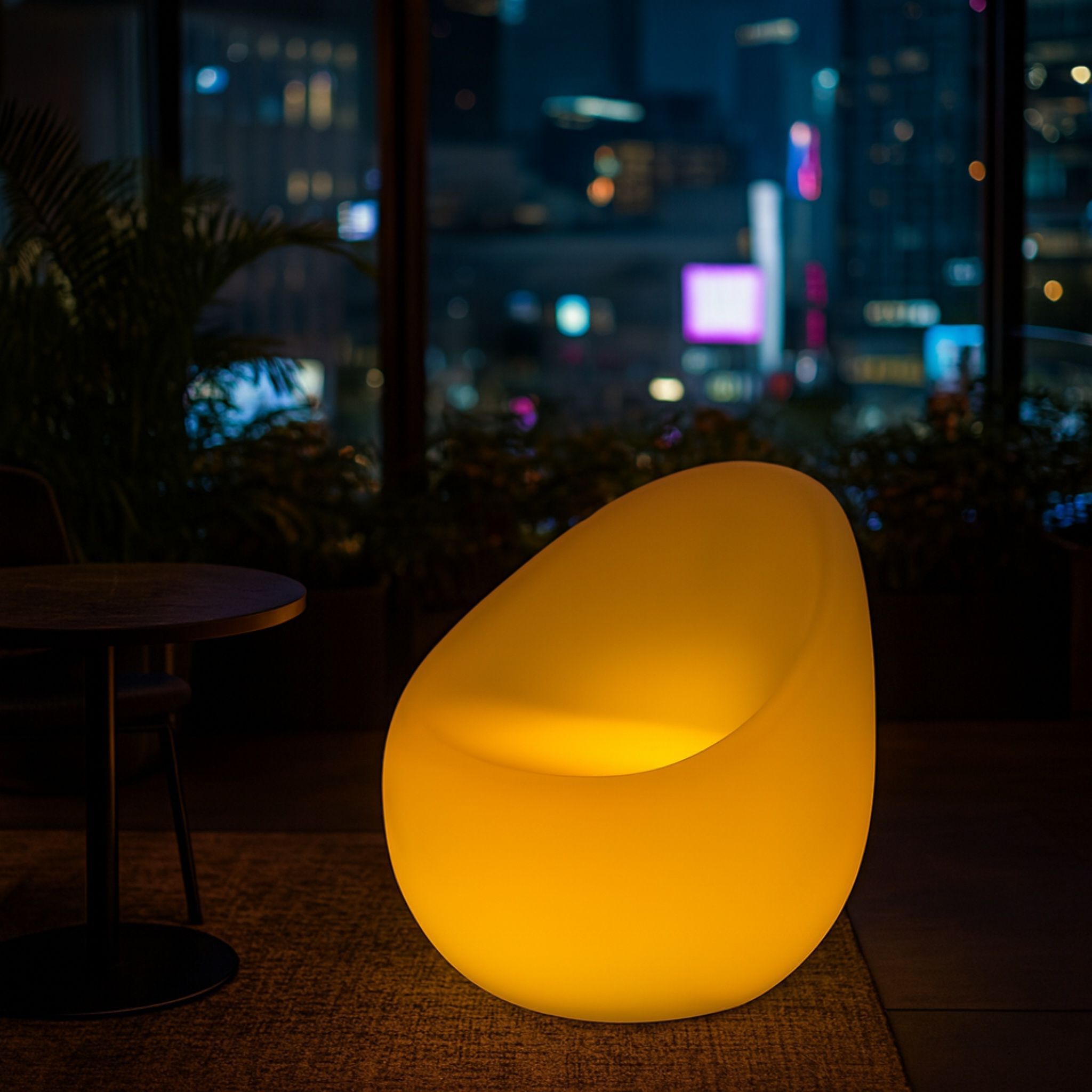 Poltrona luminosa dal design moderno, con oltre 30 tonalità di luce regolabili diffonde un’illuminazione personalizzabile. Realizzata in materiale resistente, è perfetta per terrazze, giardini, lounge e ambienti contract. Un complemento scenografico che unisce comfort, funzionalità e forte impatto visivo.