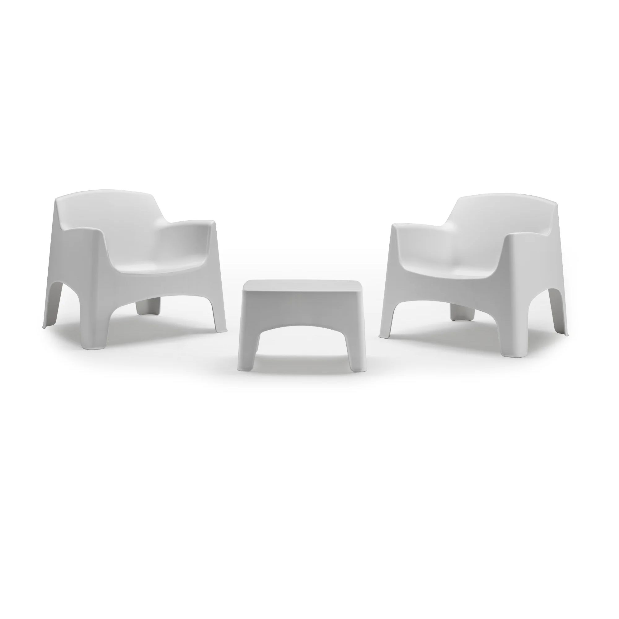 Set da esterno in resina monoblocco composto da due poltrone ergonomiche e un tavolino coordinato. Resistente, leggero, facile da pulire e perfetto per uso contract grazie alla possibilità di impilare le poltrone. Ideale per bar, hotel, piscine e spazi privati. Disponibile in diversi colori per adattarsi a ogni stile.