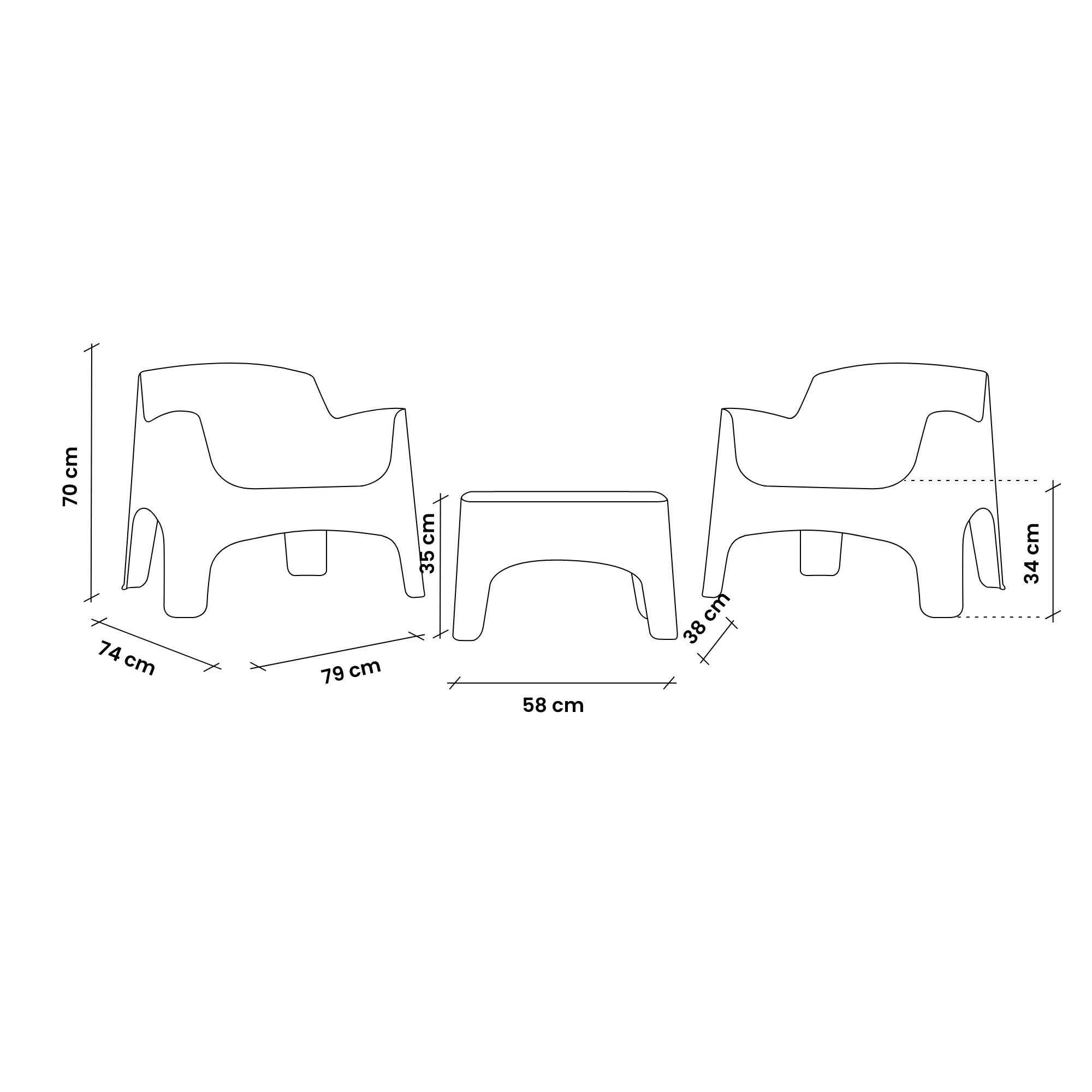 Set monoblocco composto da due comode poltrone (79x74x70) e tavolino coordinato (58x38x35)