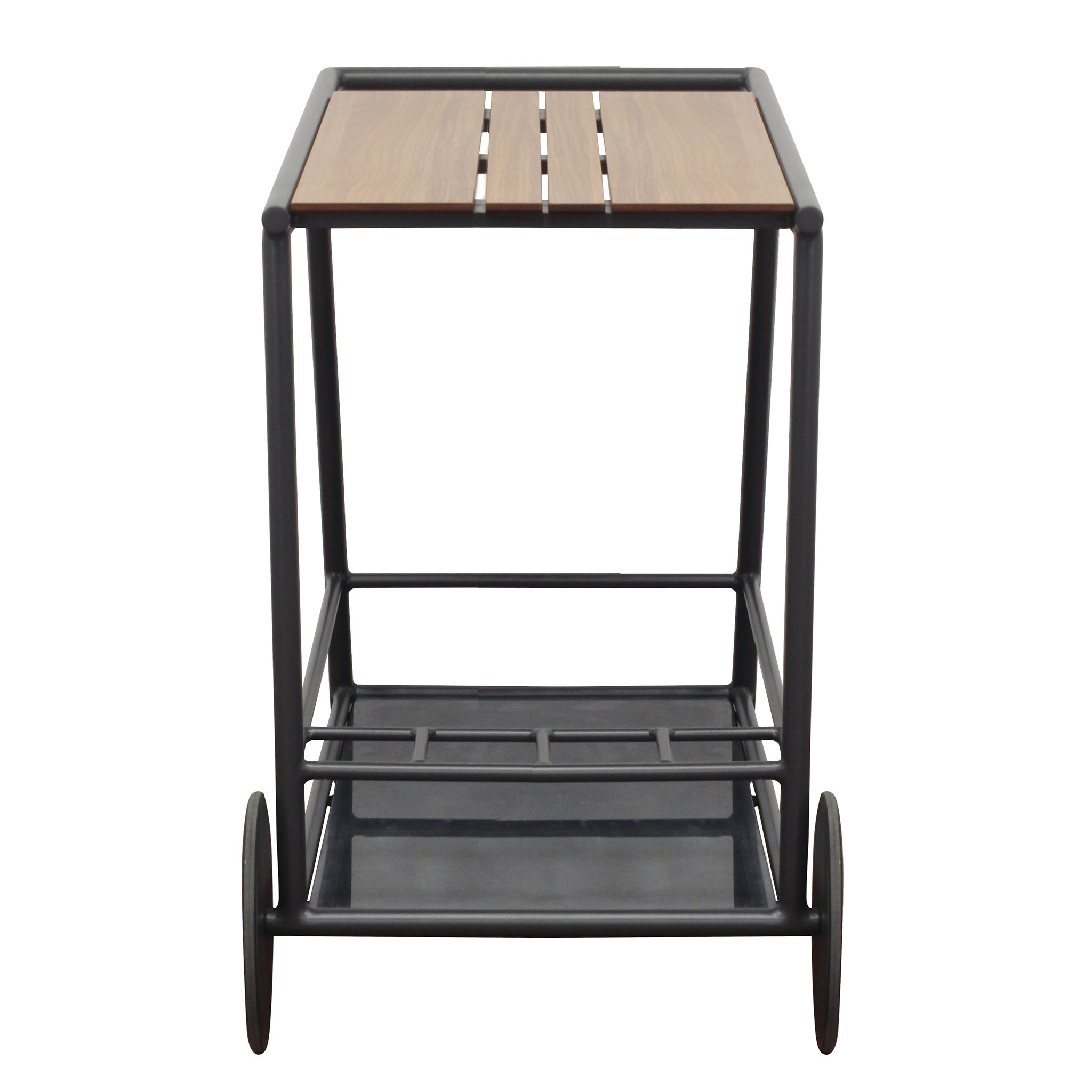 Carrello di design con struttura in alluminio, piano in HPL e sottopiano in vetro satinato. Un accessorio di alta gamma, ideale per ambienti outdoor eleganti. Disponibile nei colori bianco e antracite.