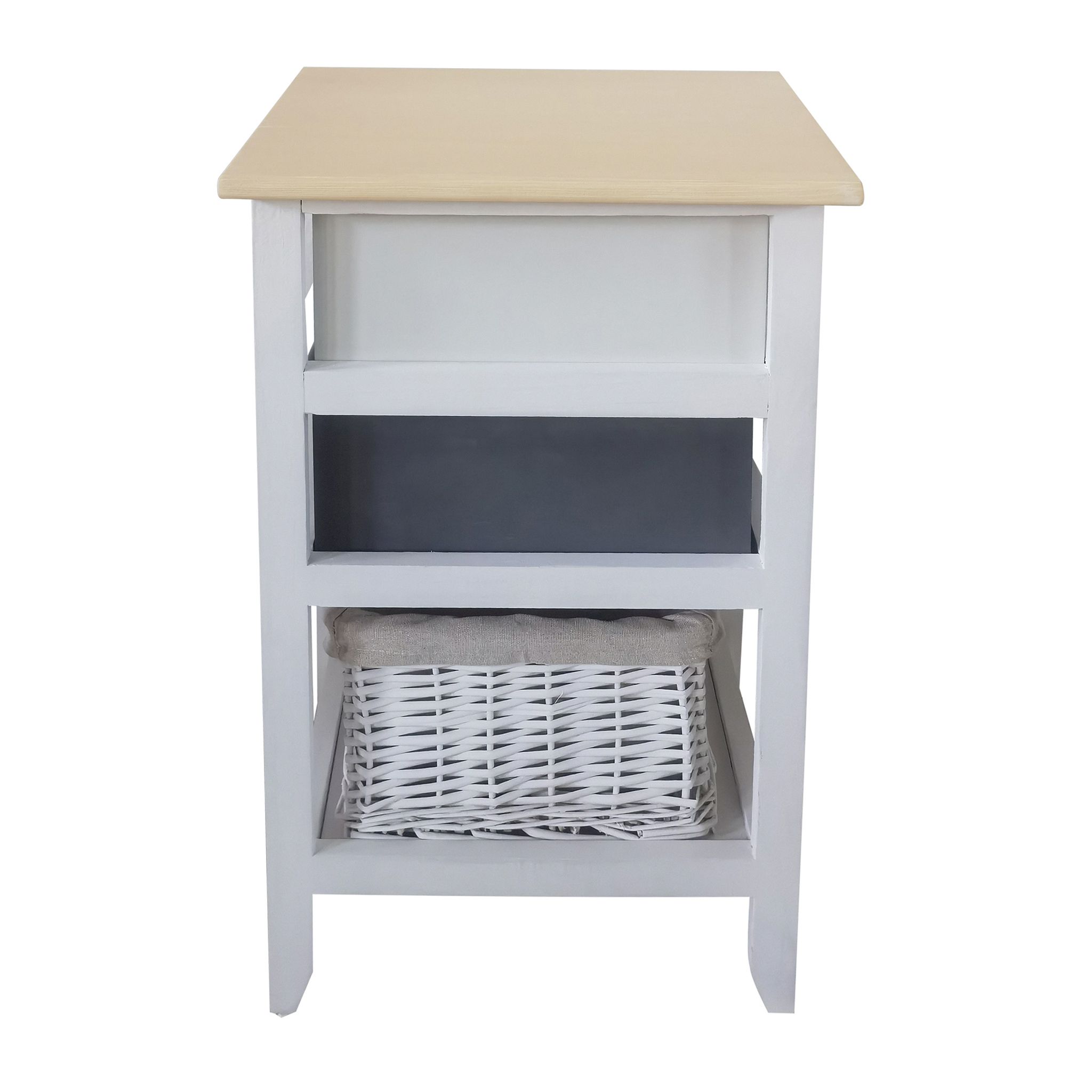 Mobiletto shabby chic con due cassetti in legno con decorazione a cuore e un ripiano con cesta in vimini foderata in tessuto. Effetto decapato per un look vintage. Ideale per ingressi, camere e bagni, è un complemento d’arredo compatto, pratico e decorativo.