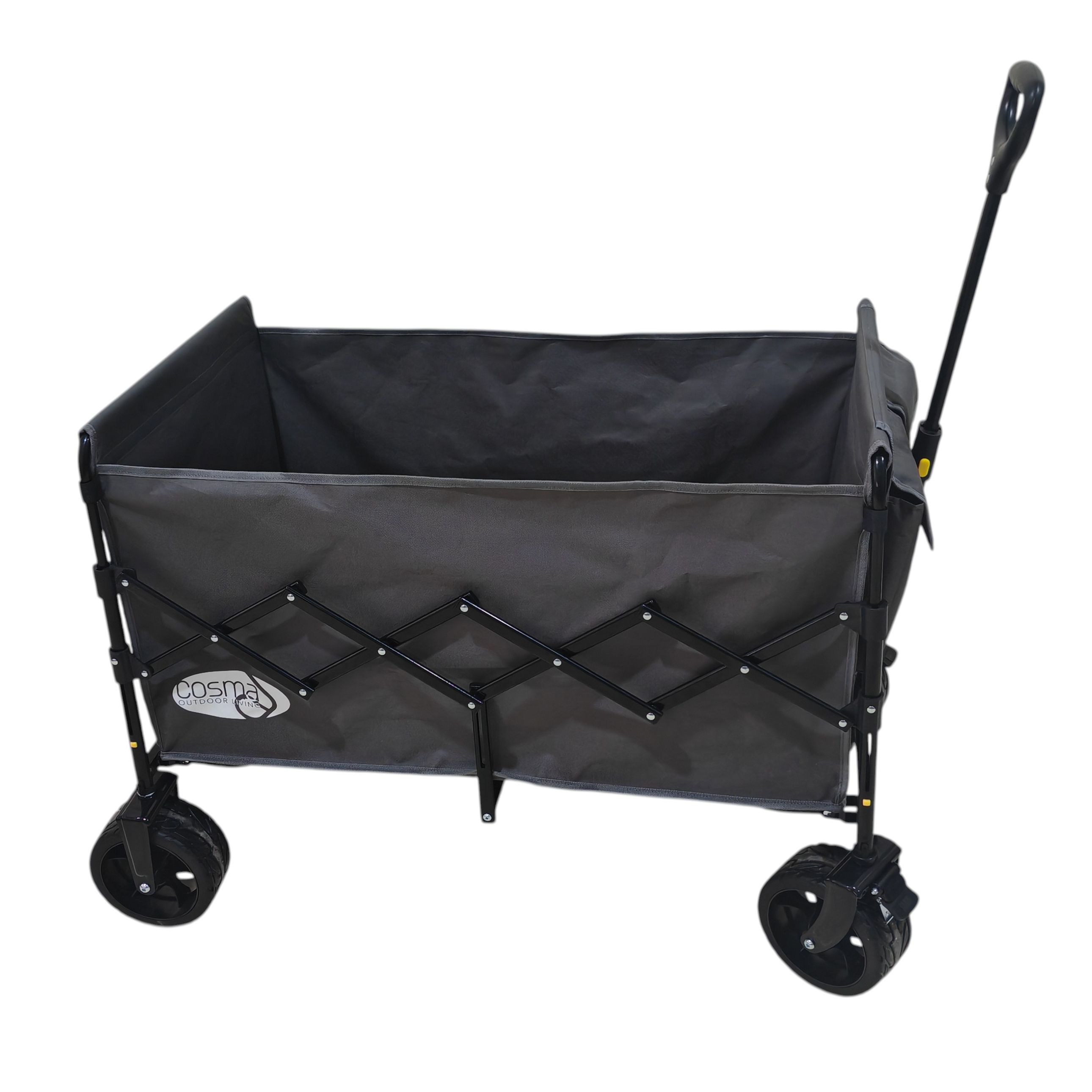Carrello da spiaggia pieghevole con struttura in metallo, tessuto removibile, ruote larghe removibili e maniglia di traino. Ampio, stabile e compatto, ideale per trasportare con facilità tutto ciò che serve per mare, campeggio o giardino.