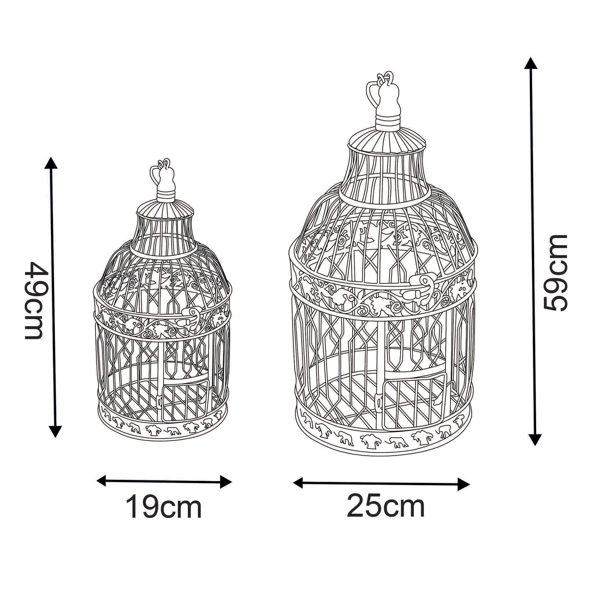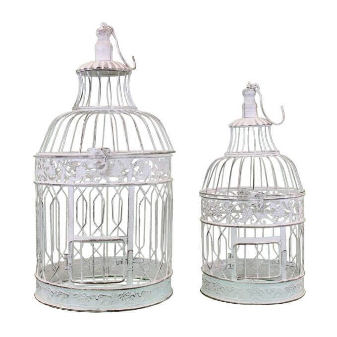 Gabbie decorative in due dimensioni in metallo bianco con finitura anticata, eleganti e versatili. Ideali come complemento d’arredo per interni o eventi, possono essere utilizzate con candele o oggetti decorativi. Perfette per creare composizioni dallo stile romantico e raffinato.