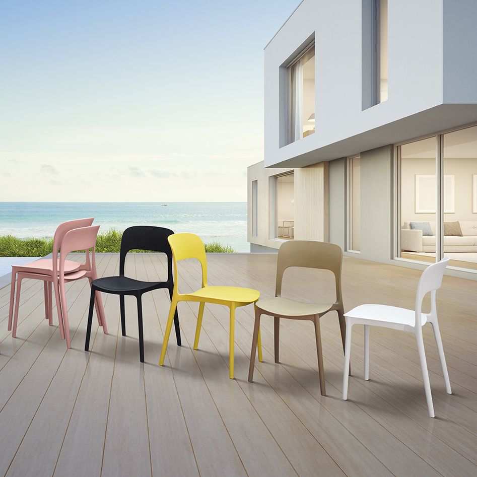 Sedia moderna in polipropilene, disponibile in giallo, grigio, nero, bianco, tortora e rosa. Leggera, resistente e perfetta per ambienti interni ed esterni.