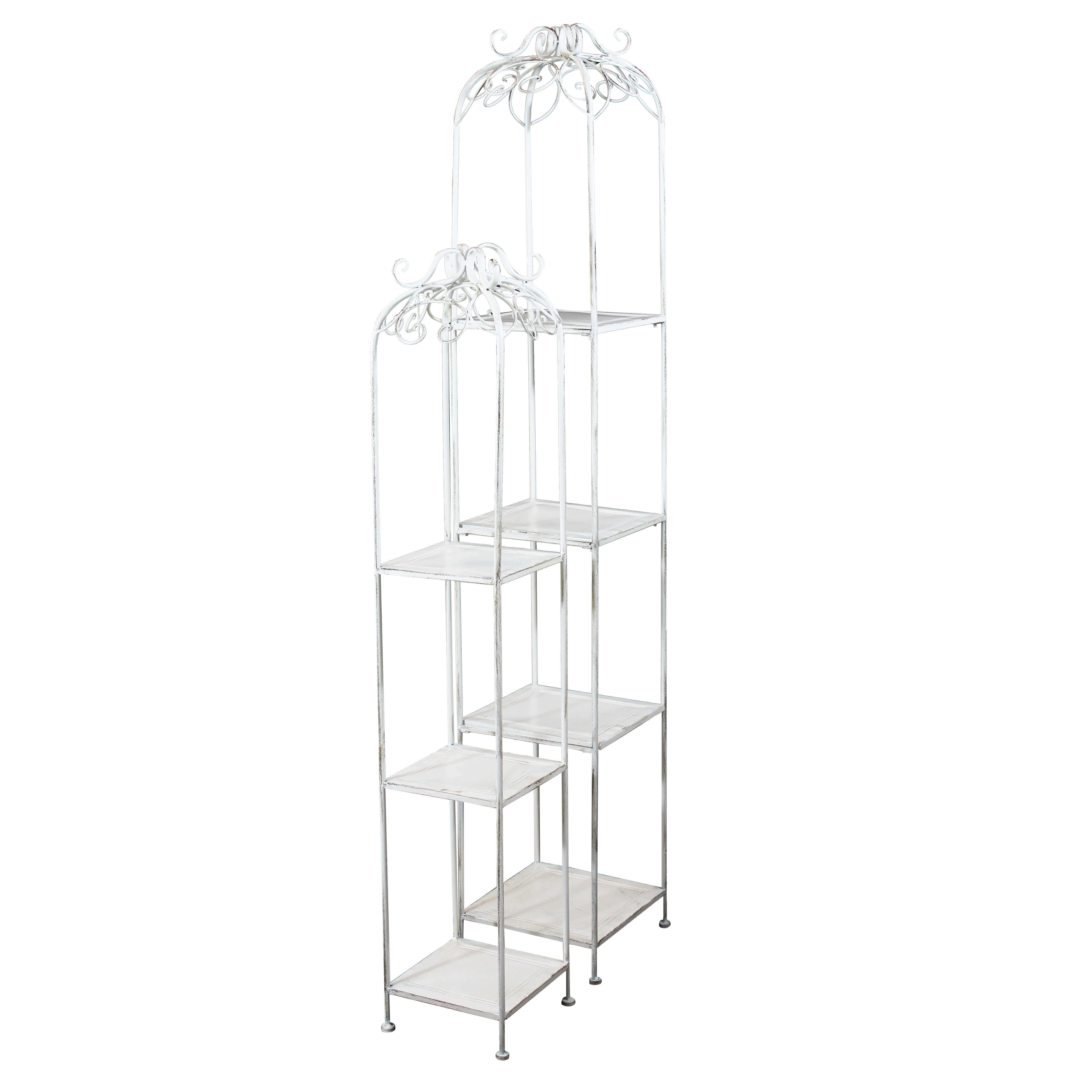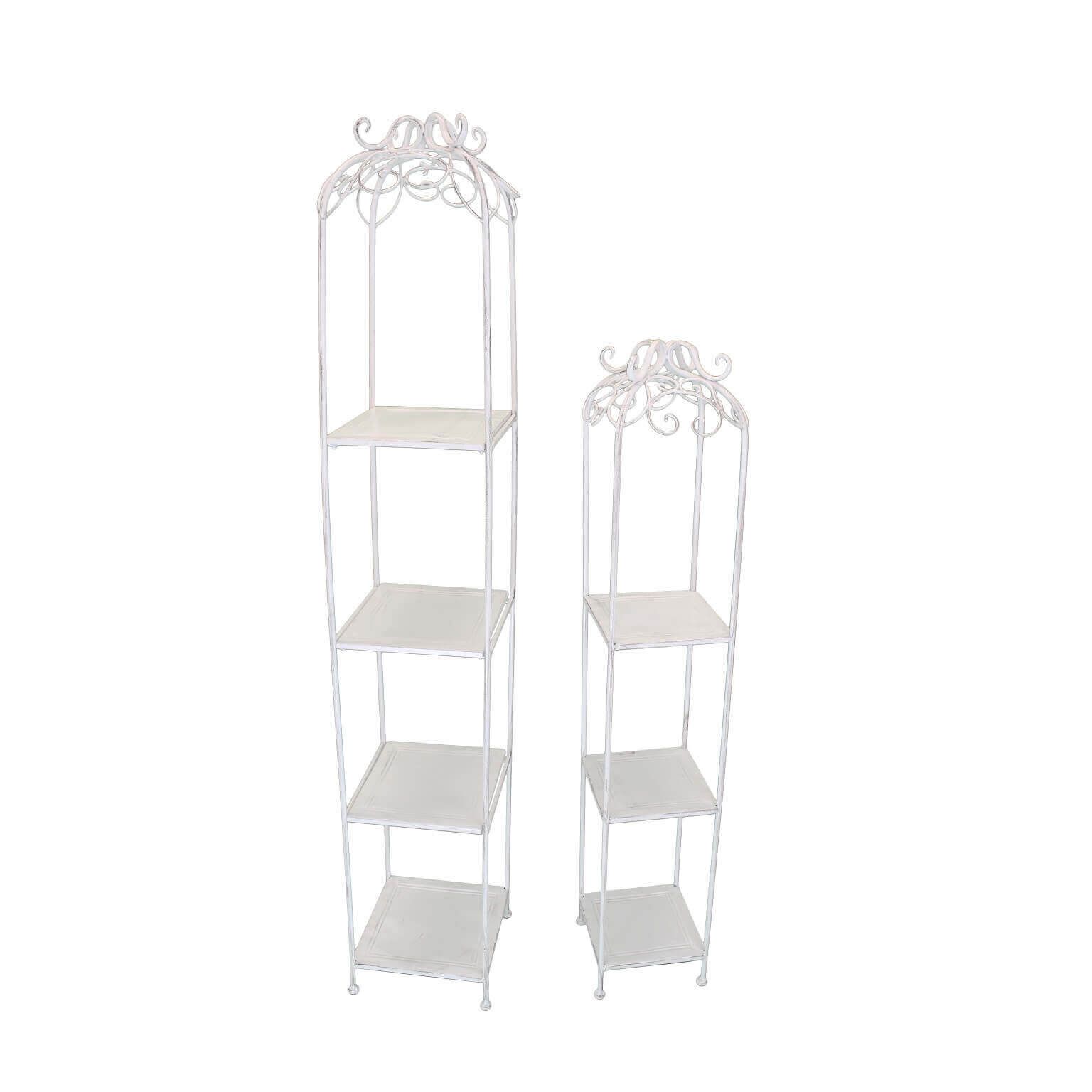 Il set di 2 scaffali provenzali in ferro verniciato, ideale per cucina o giardino, unisce design rustico e romanticismo con dettagli decorativi, ripiani grigliati e sponde laterali, in robusto materiale verniciato bianco.