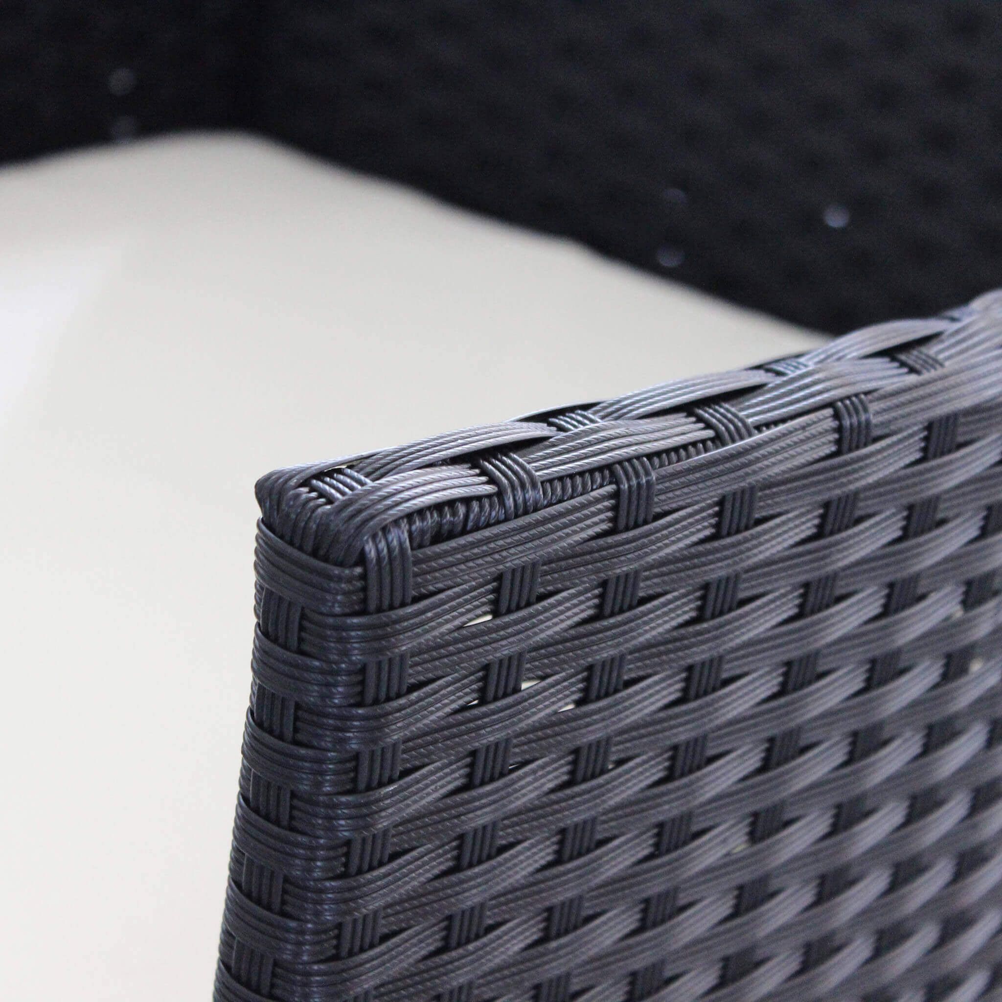 SHAN è il nostro salottino con struttura in acciaio e rivestito in wicker sintetico con cuscini e piano in vetro, realizzato per 4 posti a sedere e in 3 diverse varianti colore grigio. marrone e nero
