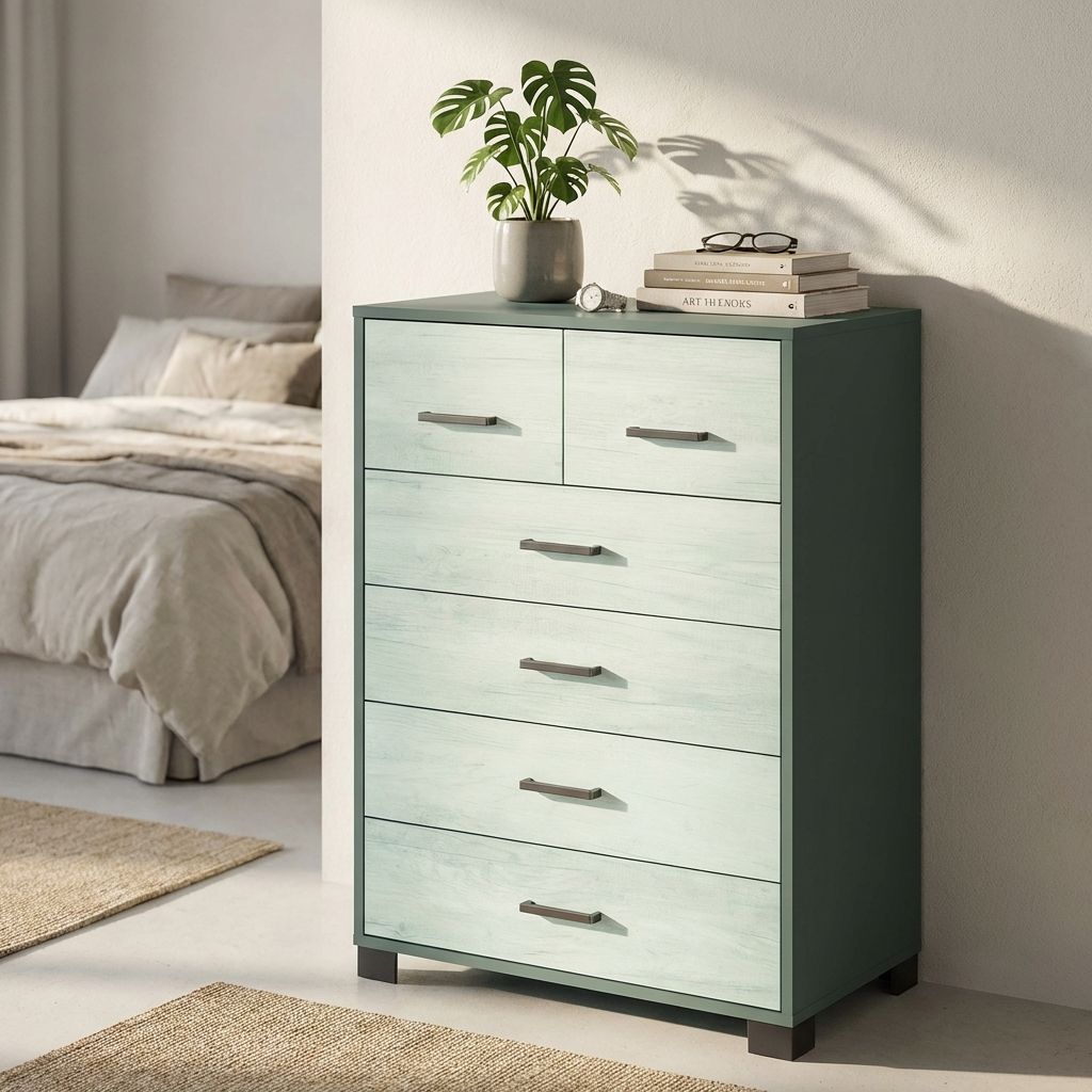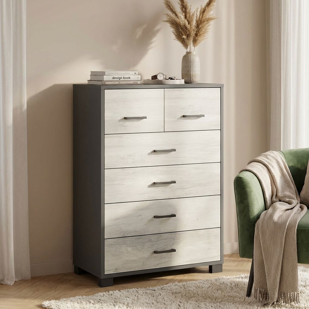 La cassettiera SIDO è un'elegante aggiunta a qualsiasi stanza, combinando stile contemporaneo e funzionalità con i suoi sei cassetti spaziosi e l'accostamento di rovere caldo e bianco opaco. Perfetta per un ambiente ordinato e raffinato, è realizzata per offrire comfort e durabilità. Disponibile in bianco/noce chiaro e bianco ossido/grigio.
