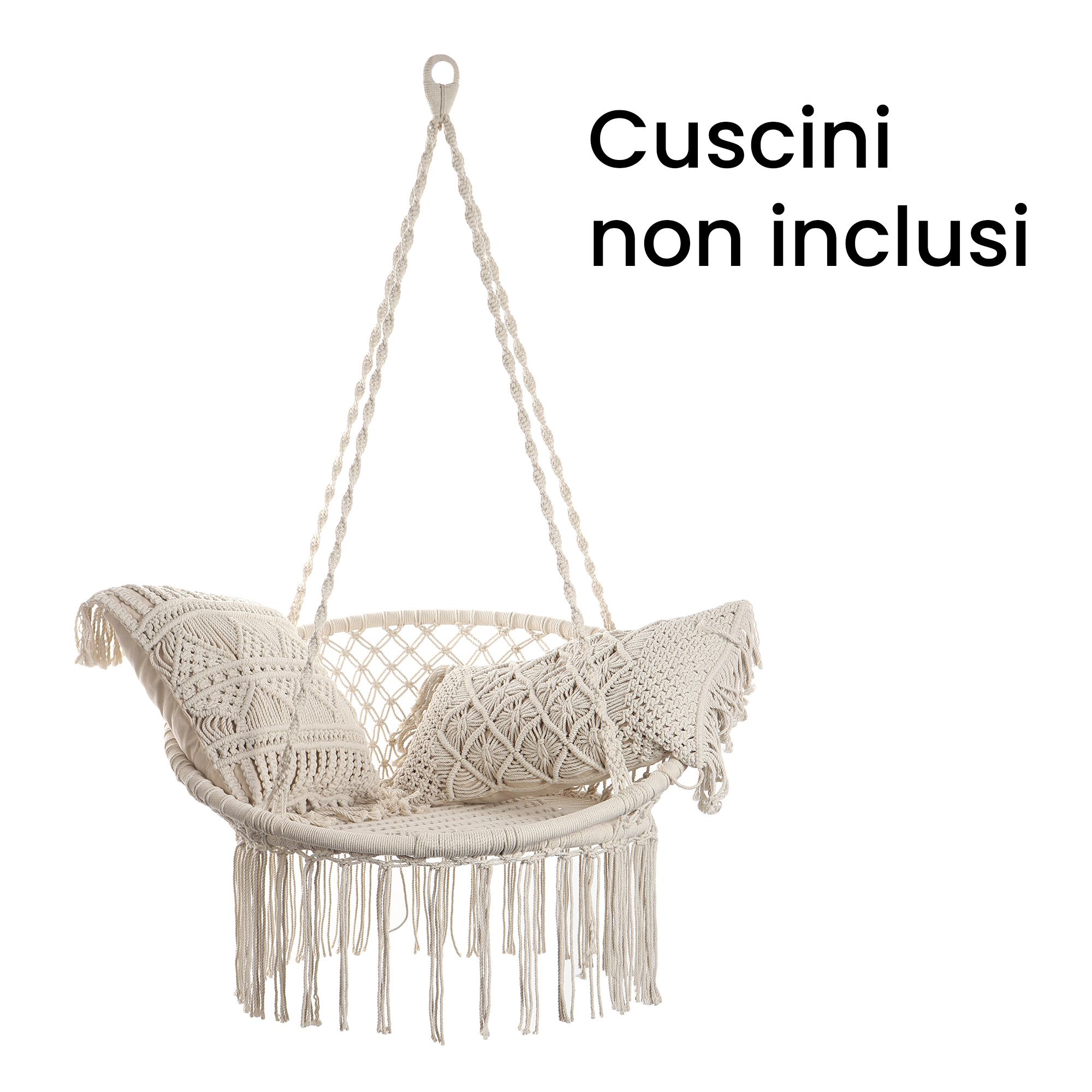 Dondolo sospeso in cotone intrecciato e legno di acacia, con frange decorative. Design bohémien, ideale per interni ed esterni coperti. Comfort avvolgente e stile naturale in un complemento d’arredo unico, perfetto per momenti di relax.