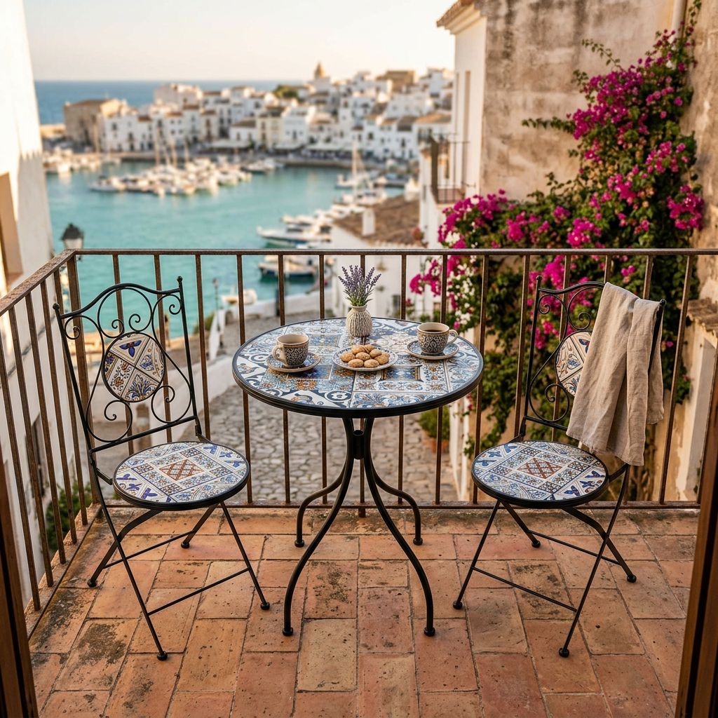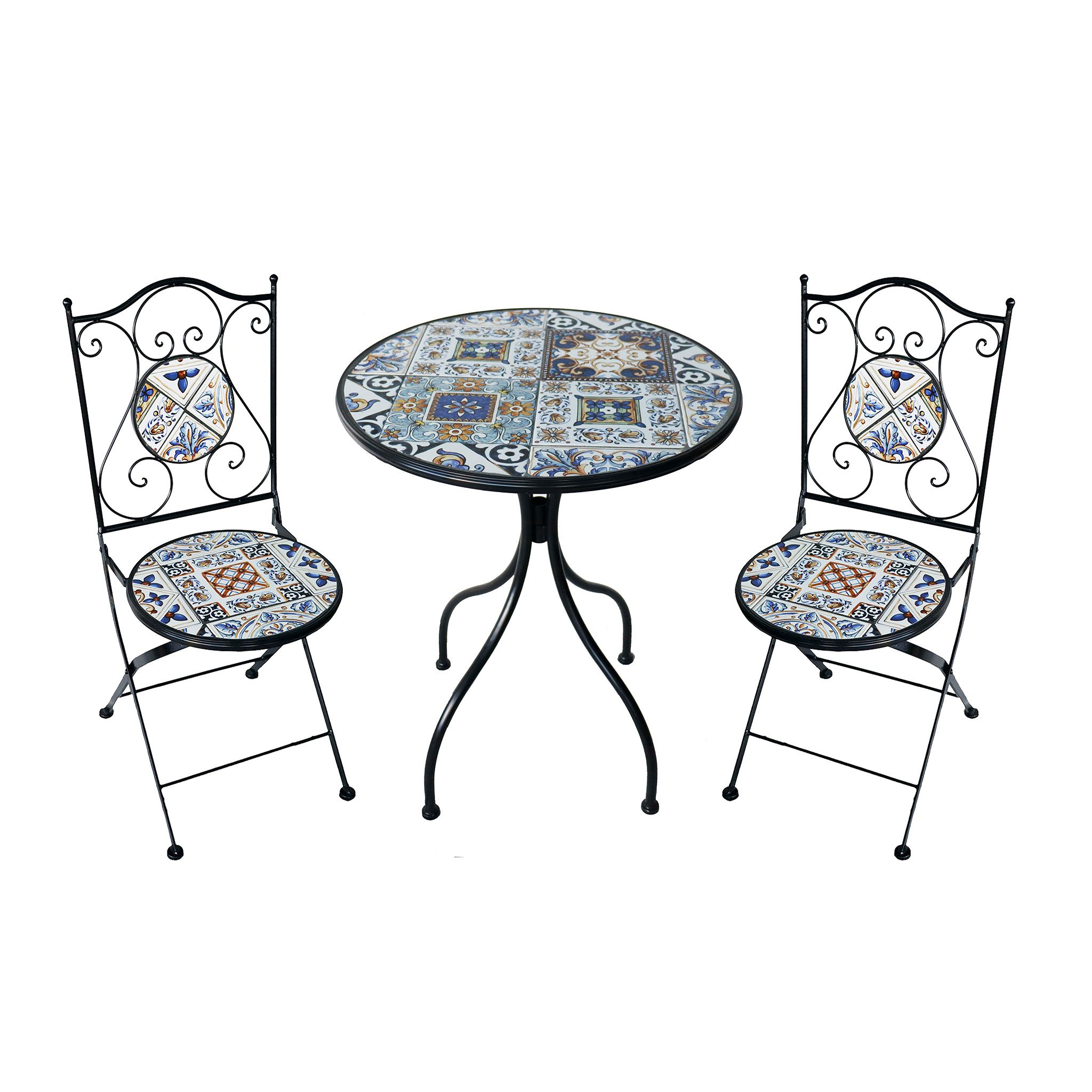Elegante set da esterno con tavolo rotondo e due sedie pieghevoli in metallo con verniciatura a polvere. Il piano del tavolo e le sedute sono decorati con splendide piastrelle in vari stili e colori. Perfetto per terrazzi, giardini e balconi, unisce resistenza e raffinatezza per un’atmosfera romantica e accogliente.