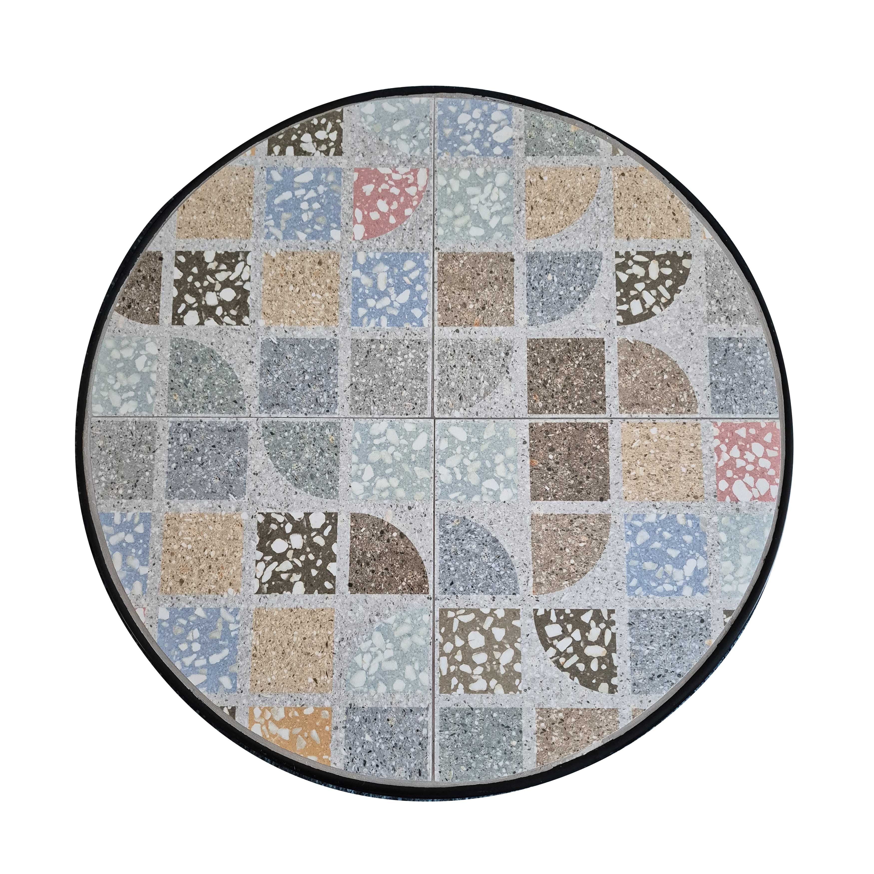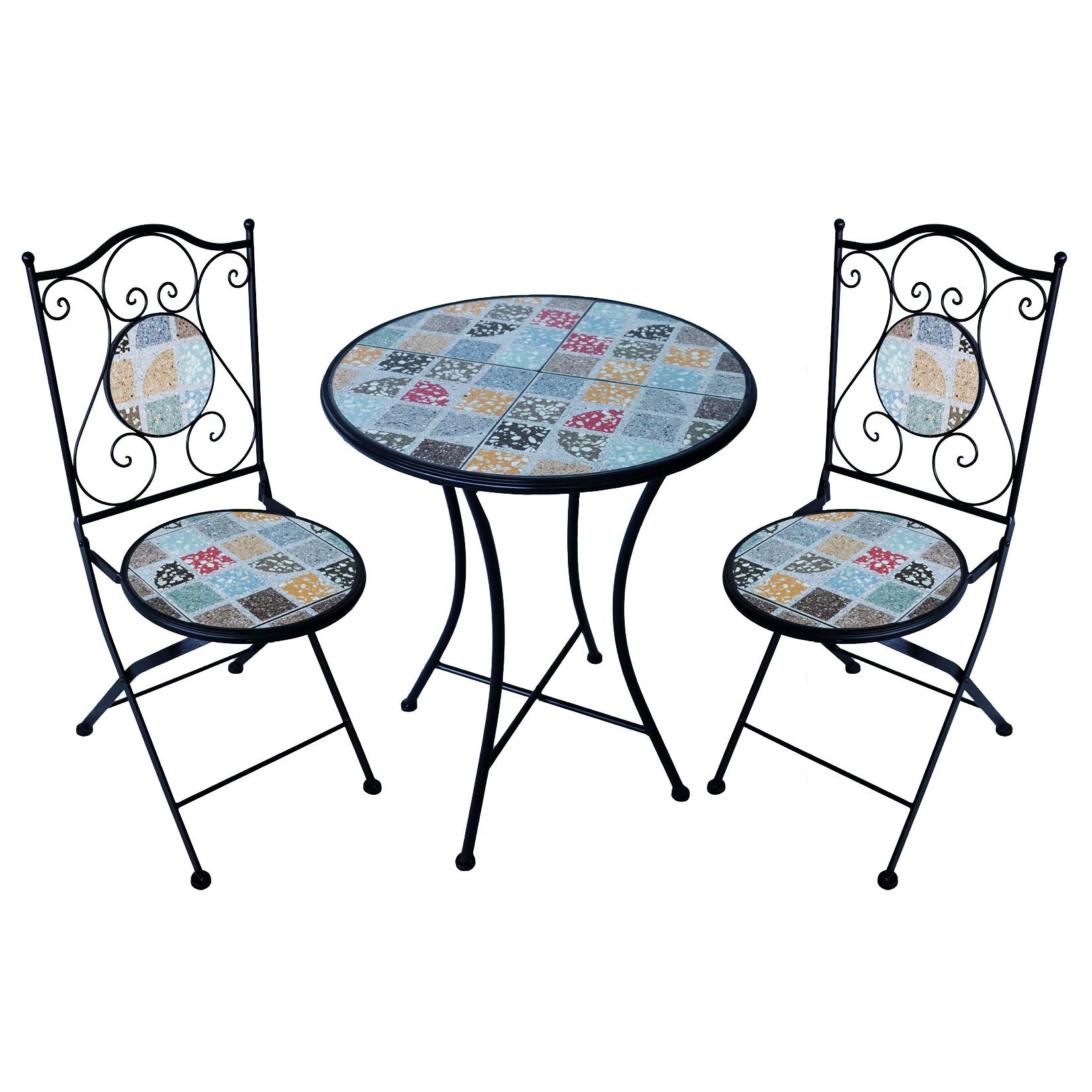 Elegante set da esterno con tavolo rotondo e due sedie pieghevoli in metallo con verniciatura a polvere. Il piano del tavolo e le sedute sono decorati con splendide piastrelle in vari stili e colori. Perfetto per terrazzi, giardini e balconi, unisce resistenza e raffinatezza per un’atmosfera romantica e accogliente.