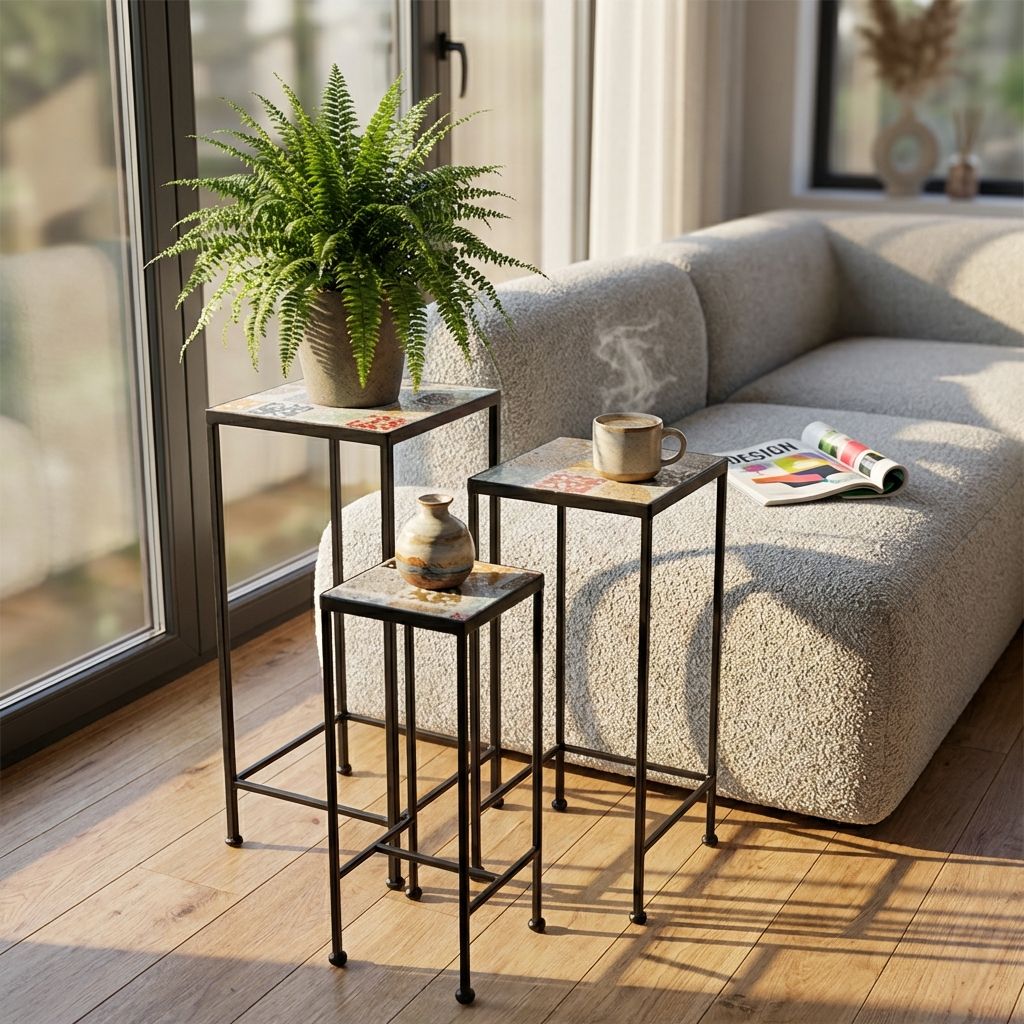 Set di tre fioriere in metallo verniciato a polvere con piano in piastrelle decorative, disponibili in diverse varianti cromatiche. L’ispirazione mediterranea delle maioliche conferisce un tocco raffinato e artistico, ideale per valorizzare ogni ambiente con stile e originalità.