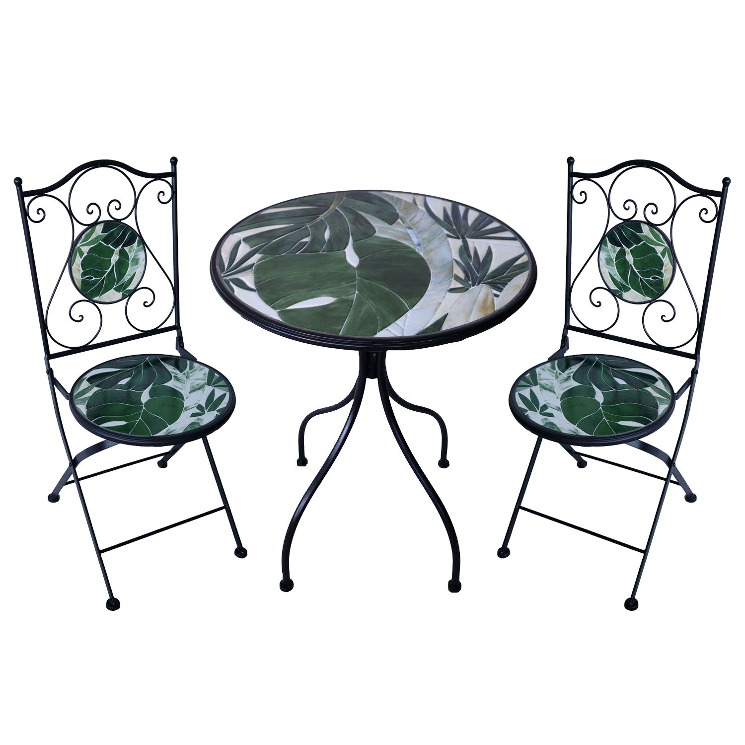 Questo elegante set da bistrot in ferro battuto e piastrelle di ceramica presenta un raffinato motivo tropicale con foglie lussureggianti. Il tavolino e le due sedie pieghevoli combinano robustezza e stile, perfetti per creare un angolo accogliente su balconi, terrazzi o giardini.
