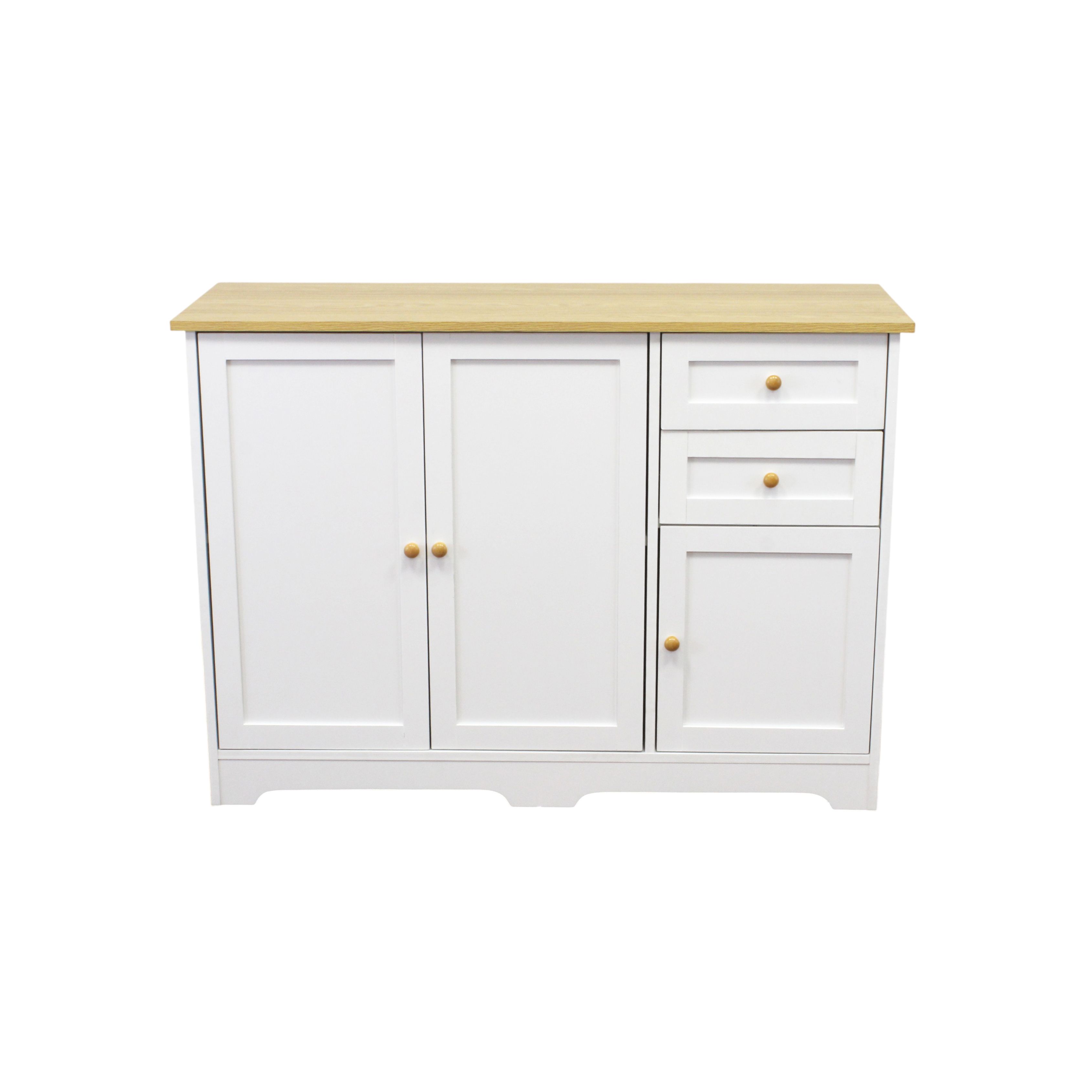 Mobile contenitore in pannello truciolare bianco con top effetto legno e maniglie in legno naturale. Dotato di tre sportelli e due cassetti, offre ampio spazio per organizzare oggetti e accessori. Versatile e funzionale, si adatta a cucina, soggiorno, ingresso o camera, unendo eleganza e praticità.