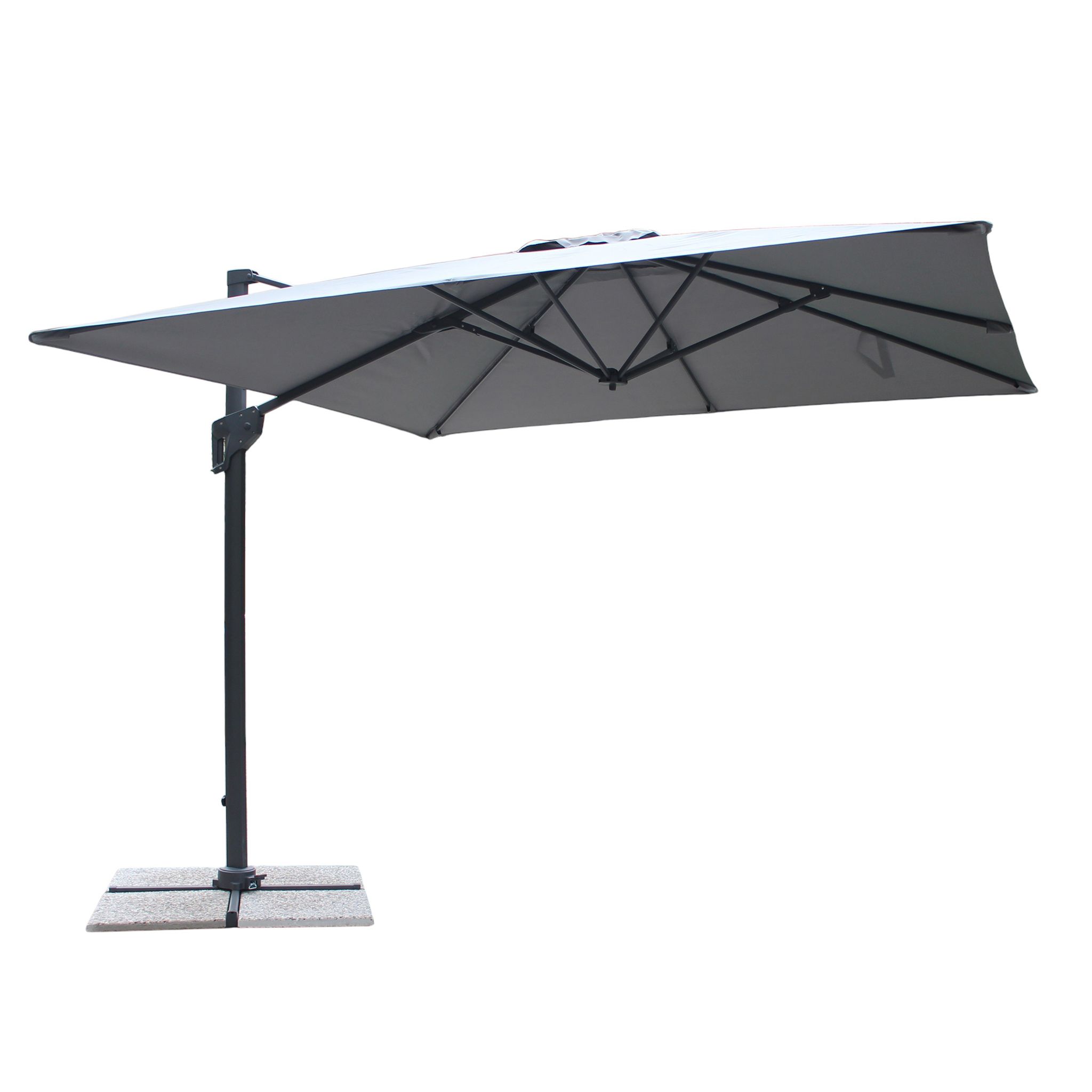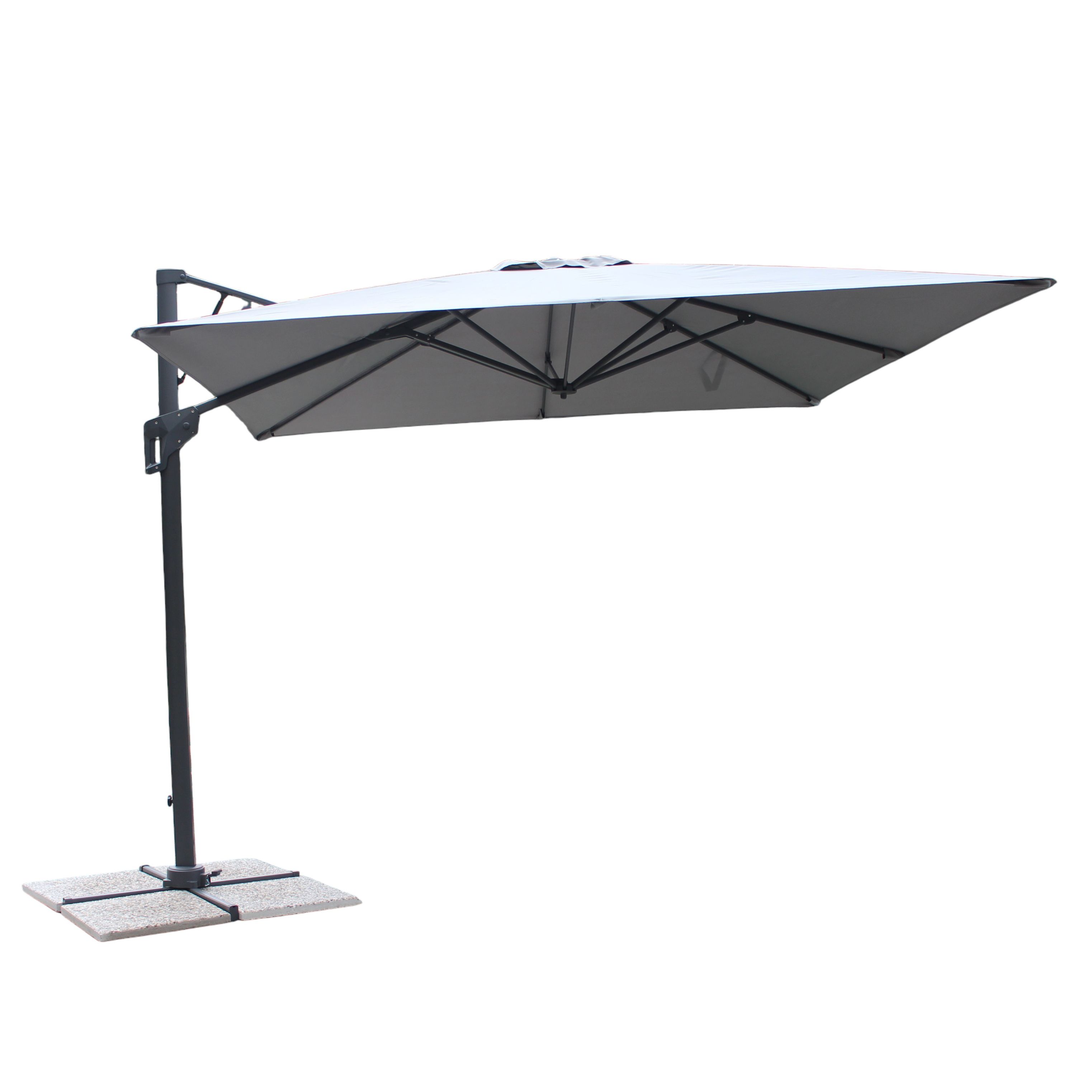 Ombrellone con palo laterale dotato di apertura automatica con pistone a gas e rotazione a 360° per godere di ombra e comfort in ogni momento della giornata. Struttura in alluminio e stecche in acciaio. Solido ed elegante, ideale per giardini, terrazze e aree relax.