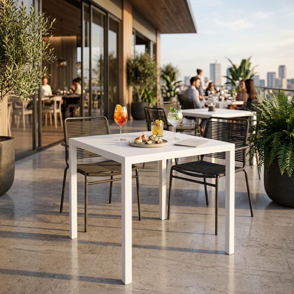 Tavolo contract 90x90 cm in metallo, ideale per bar, ristoranti, terrazze e spazi professionali. Struttura solida e resistente con sistema autolivellante per garantire stabilità anche su superfici irregolari. Design essenziale e moderno. Disponibile nei colori bianco e antracite.