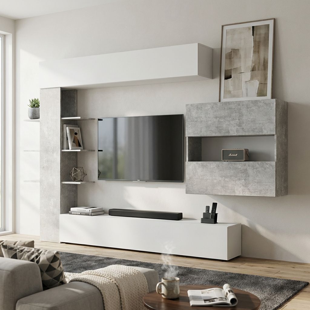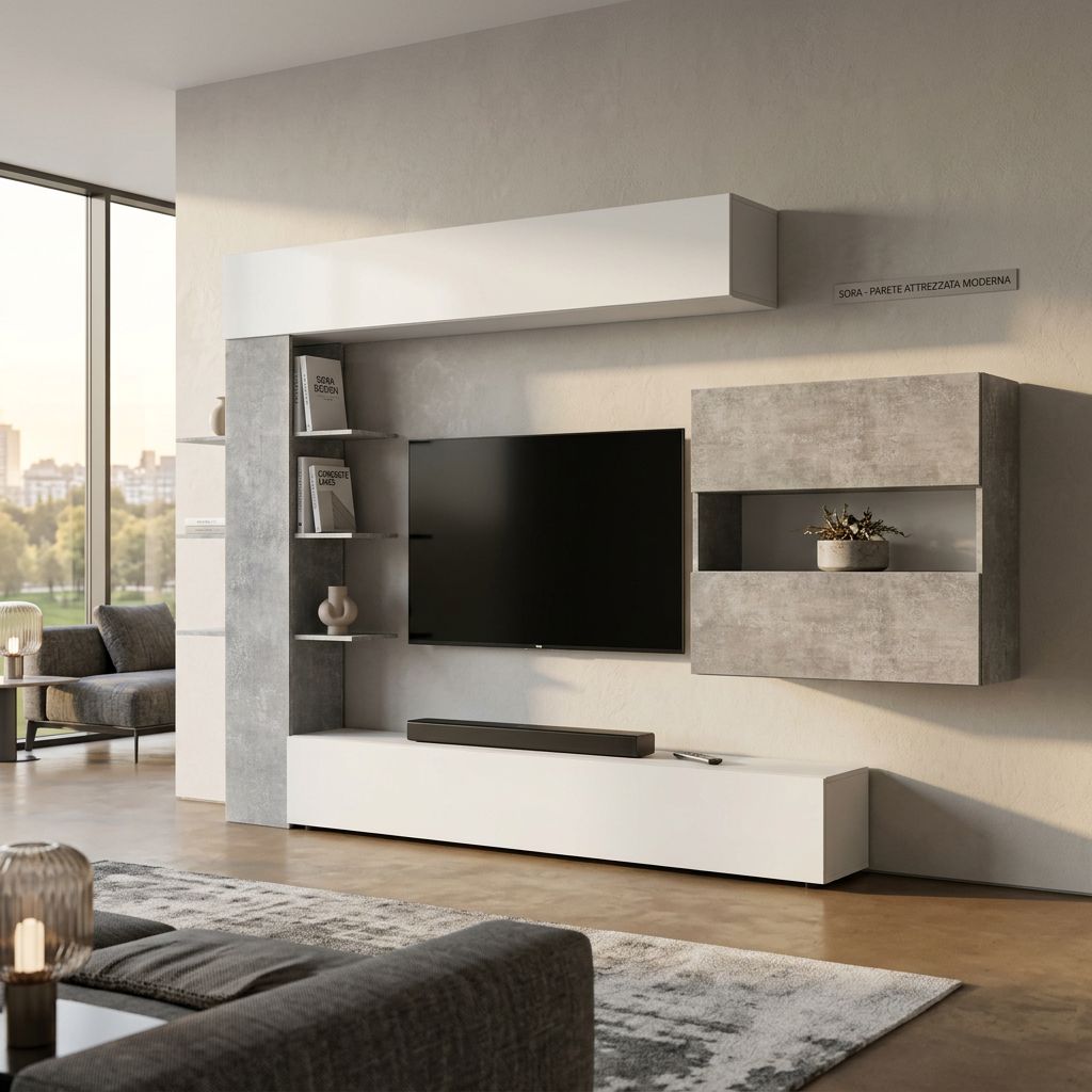 La parete attrezzata SORA, elegante e funzionale, è l'ideale per chi cerca stile e ordine nel proprio living. Con spazi dedicati per il TV, ripiani per oggetti decorativi e una base ampia per dispositivi, SORA è perfetta per un ambiente living moderno e ordinato. Aggiungi un tocco di modernità e organizzazione al tuo spazio con SORA.