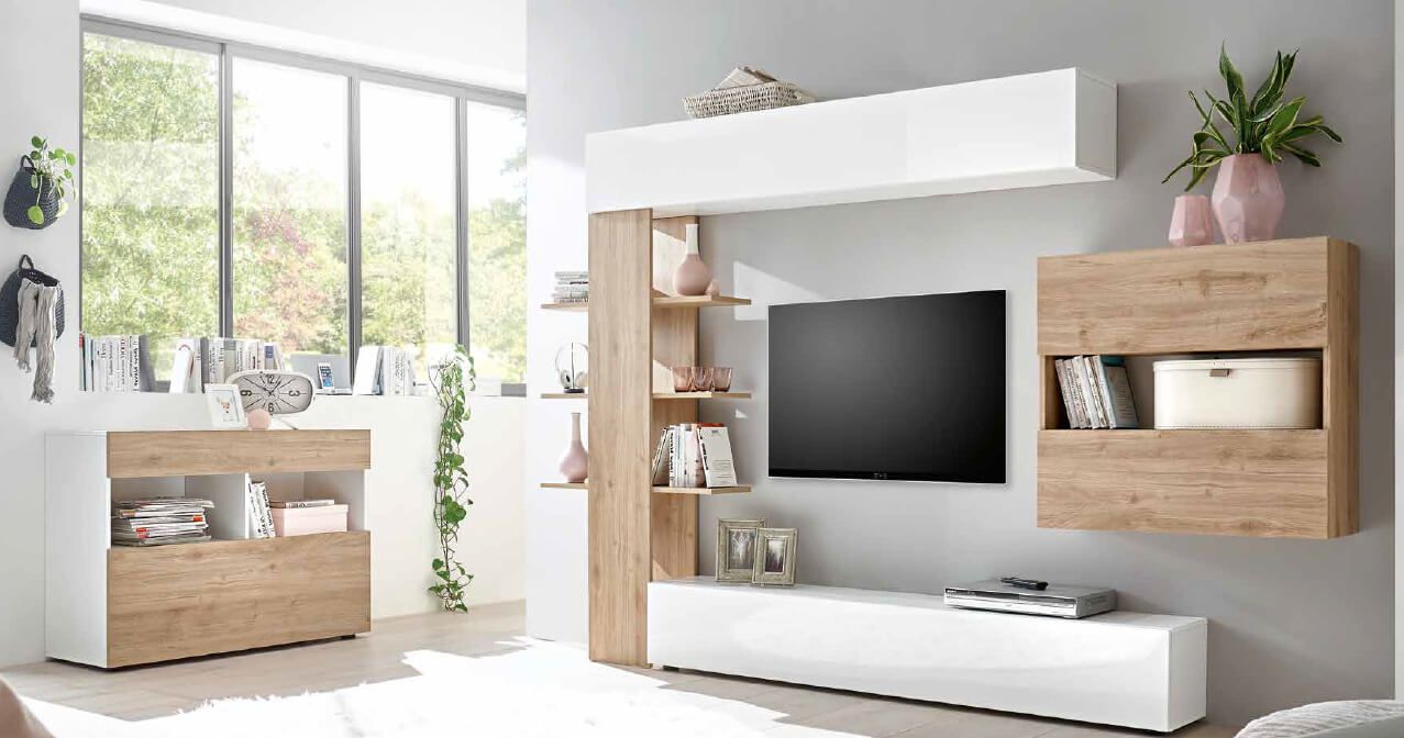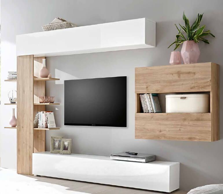 La parete attrezzata SORA sfoggia un design moderno e minimalista. Il televisore è montato direttamente sulla parete, fungendo da elemento centrale di questa composizione. A sinistra del televisore, una struttura verticale con ripiani offre spazio per esporre libri o oggetti decorativi. Sulla destra del televisore, un modulo contenitivo con anta ribaltabile fornisce uno spazio organizzato e nascosto, adatto a conservare oggetti che si preferisce non esporre.Al di sopra di questo modulo, una mensola a muro offre ulteriore spazio espositivo, mentre la parte superiore del mobile è sormontata da una lunga mensola orizzontale che corre lungo tutta la lunghezza, perfetta per oggetti decorativi o contenitori. Questa mensola crea una sorta di cappello superiore che contribuisce all'estetica del mobile.Sottostante al televisore, si estende un'ampia base orizzontale che può essere utilizzata per posizionare dispositivi multimediali o altri oggetti di uso quotidiano. La base amplia la funzionalità del mobile, permettendo un facile accesso e una visualizzazione ordinata.L'equilibrio tra i vari elementi del mobile SORA, con i suoi spazi aperti e chiusi, rende questo pezzo di arredamento versatile e adatto a differenti stili di interni, mantenendo un senso di leggerezza e modernità.