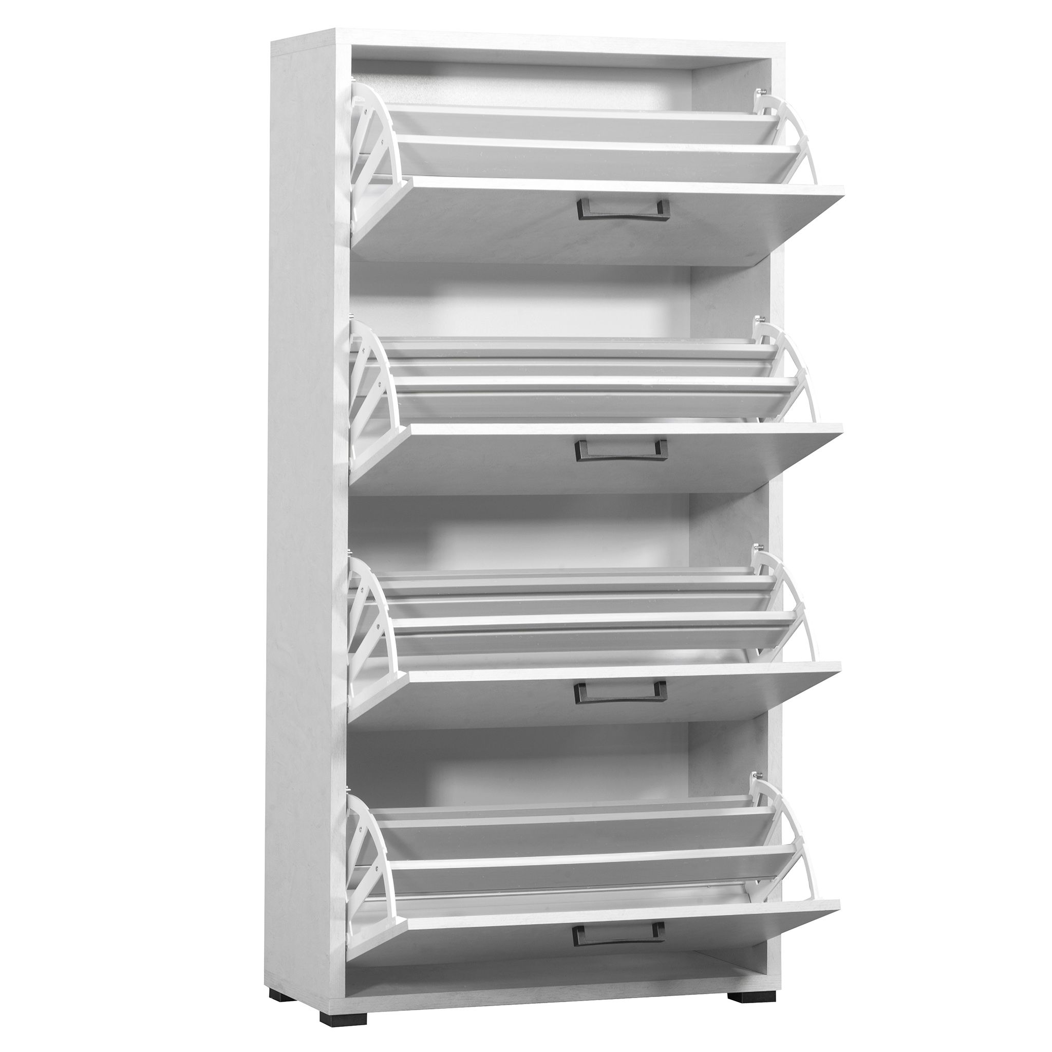La scarpiera SPINE è disponibile in bianco, marrone, rovere e cemento e in due dimensioni differenti da 3 ante o 4 ante