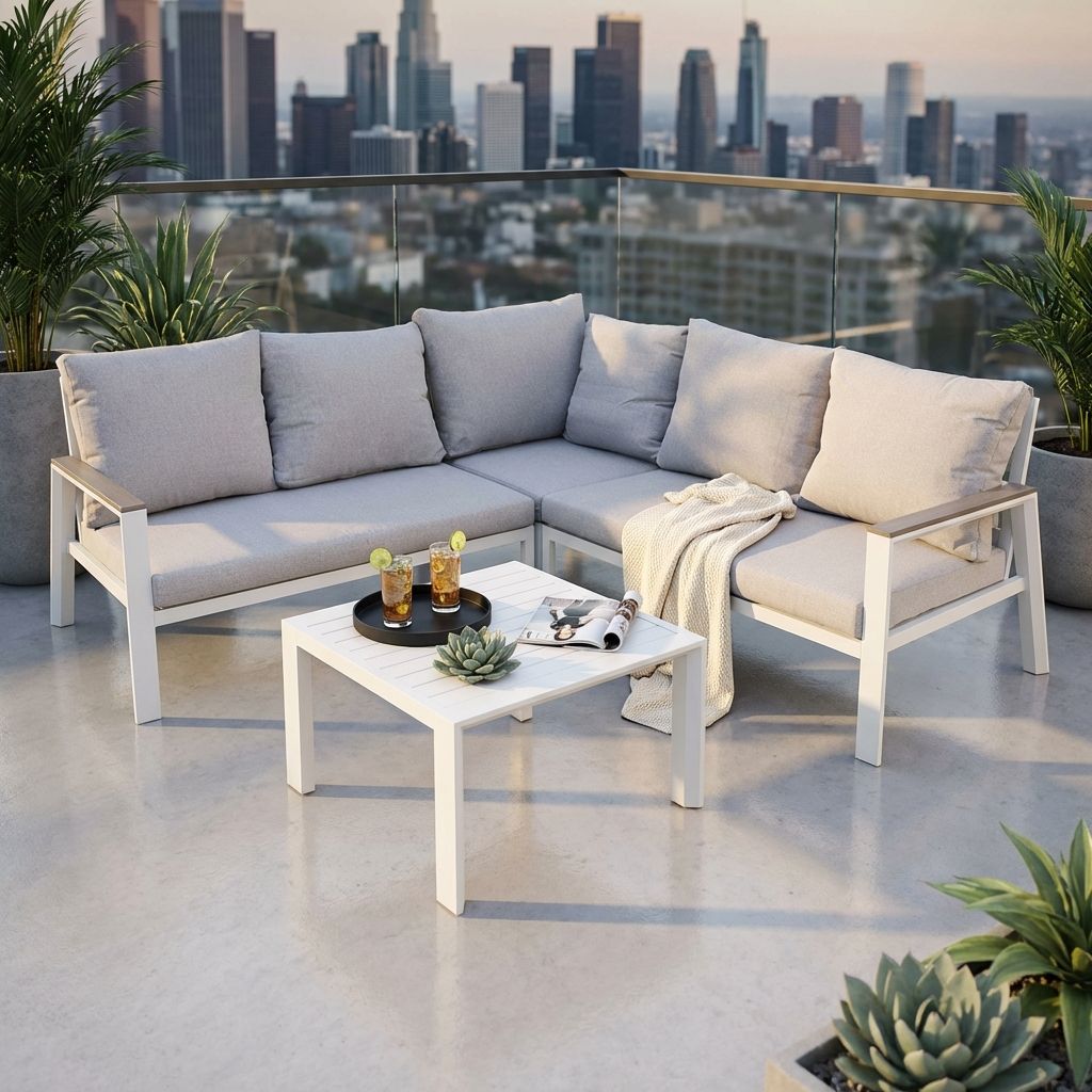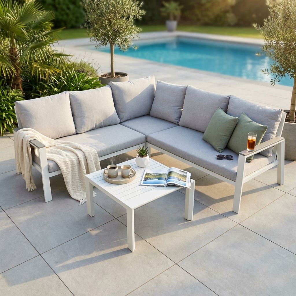il divano o salotto angolare SUKARNO comodo ed elegante con struttura in alluminio e cuscini sfoderabili con braccioli in polywood viene realizzato in 2 classiche varianti bianco e antracite